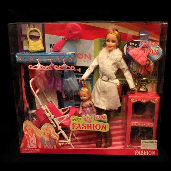 This is a fancy dress-up doll set with fashion accessories, a baby doll, a pram and some clothes hangers. The set is finely designed and made to boost added attractiveness. Little girls will enjoy hours of mix-and-match fun with this adorable dress-up doll.