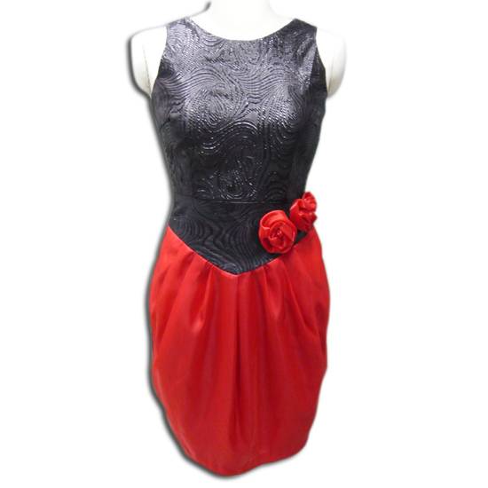 This is an evening dress with a two red rose-like embellishment. The upper part is a sleeveless black top with irregular line patterns. The low part is a red dress which is in harmonious with the red rose decoration.