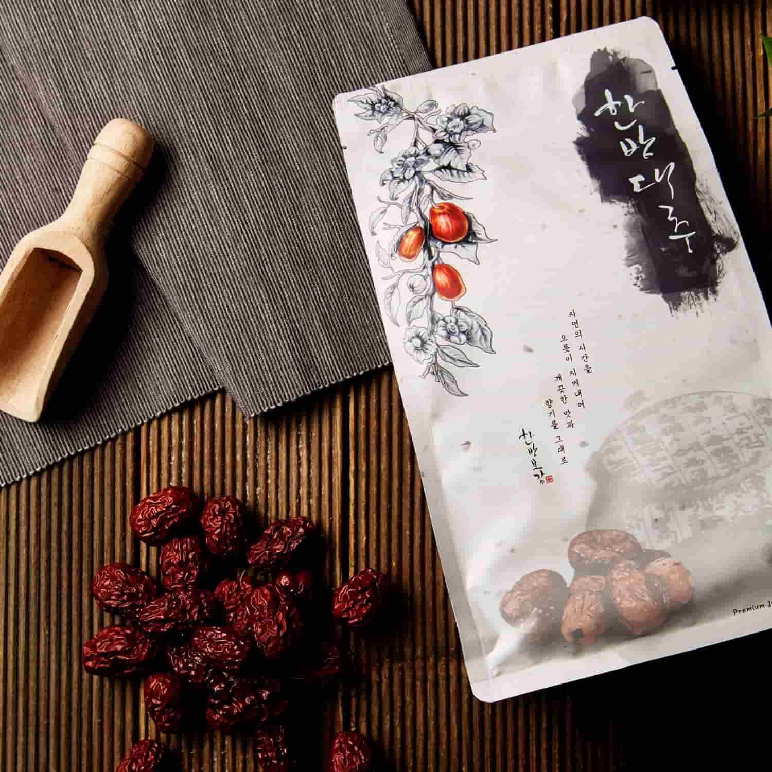 The premium jujube brand Hanbang Bogam's fruit. They are dried raw jujubes that contain oriental medicinal herbs to preserve the natural flavor. They are good to see with food, tea, and salad. They are also tasty when cut into slices and eaten by themselves