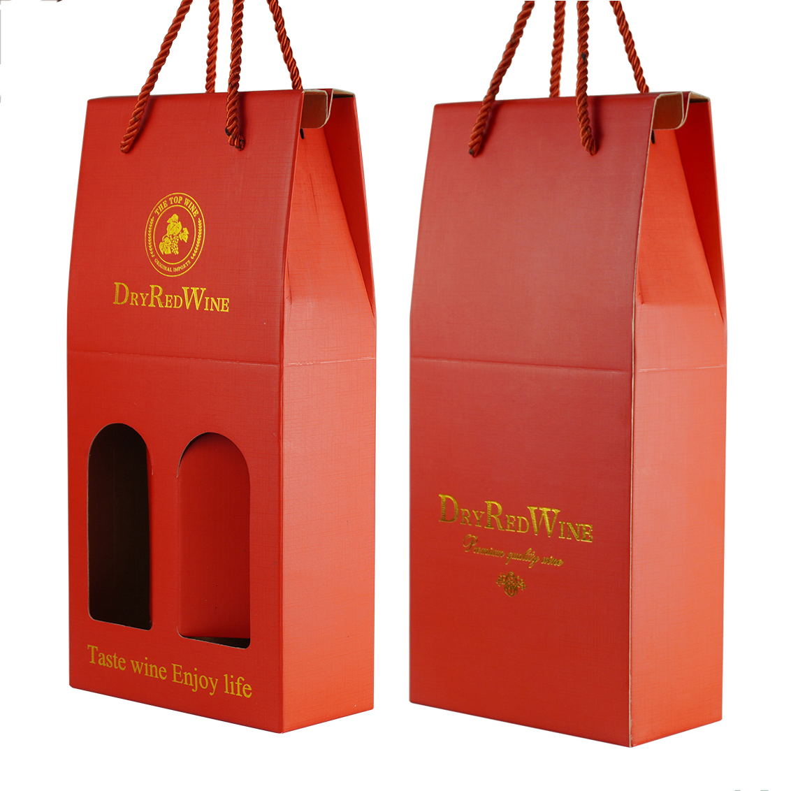 This high-grade paper shopping bag is specially designed for single or double red wine bottles, combining sturdy cardboard material with durable nylon handles for reliable carrying, elegant presentation, and convenient gifting and retail use.