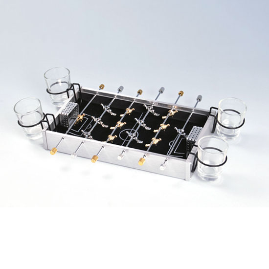 This is a table soccer game with four glasses of alcohol on both sides. This drinking game boasts a robust housing for a long service life. This interesting game is ideal for adults to play with.