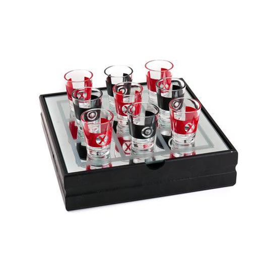 This drinking game set includes a tic-tac-toe game board and glasses printed with noughts and crosses. The game board features a mirror upper surface and a wooden base. The set is sturdily constructed for a long service life.
