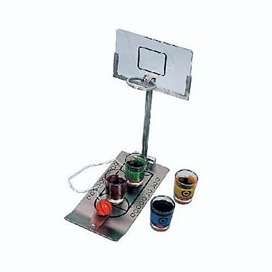 The drinking glass game features a mini basketball and a stand with 4 shot glasses. The shot glasses come in different colors and designs. Drink with your friends by playing this novelty drinking game for an amusing party.