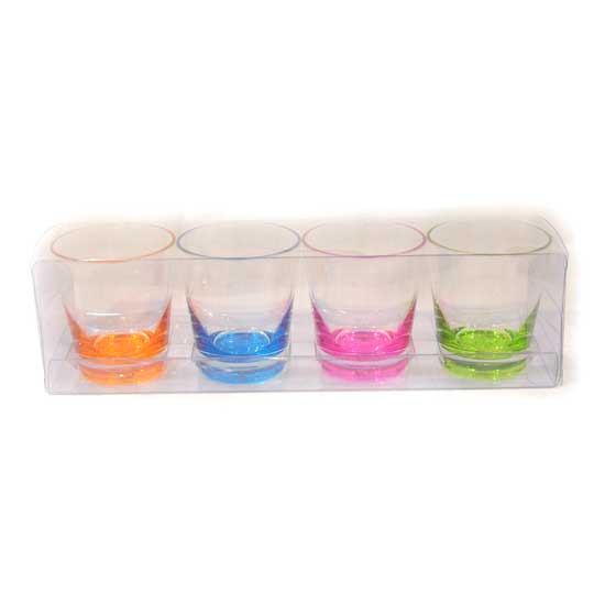 Shown here is a set of round drinking glasses featuring vibrant colors of orange, blue, pink and green at bases and rims. Made of acrylic, the glasses ensure a long lifespan. This transparent drinking glass makes a wonderful piece for home and bar use.