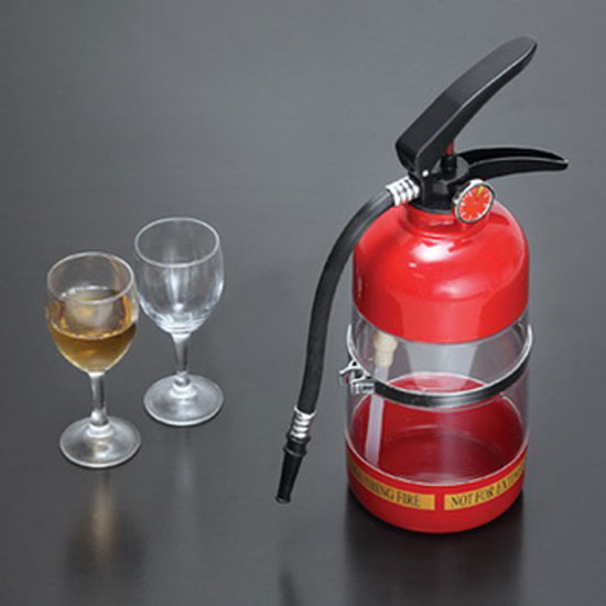 This drinking set includes an alcohol container and 2 drinking glasses. The alcohol container comes in the shape of a fire extinguisher. The set is sturdily constructed for a long service life.