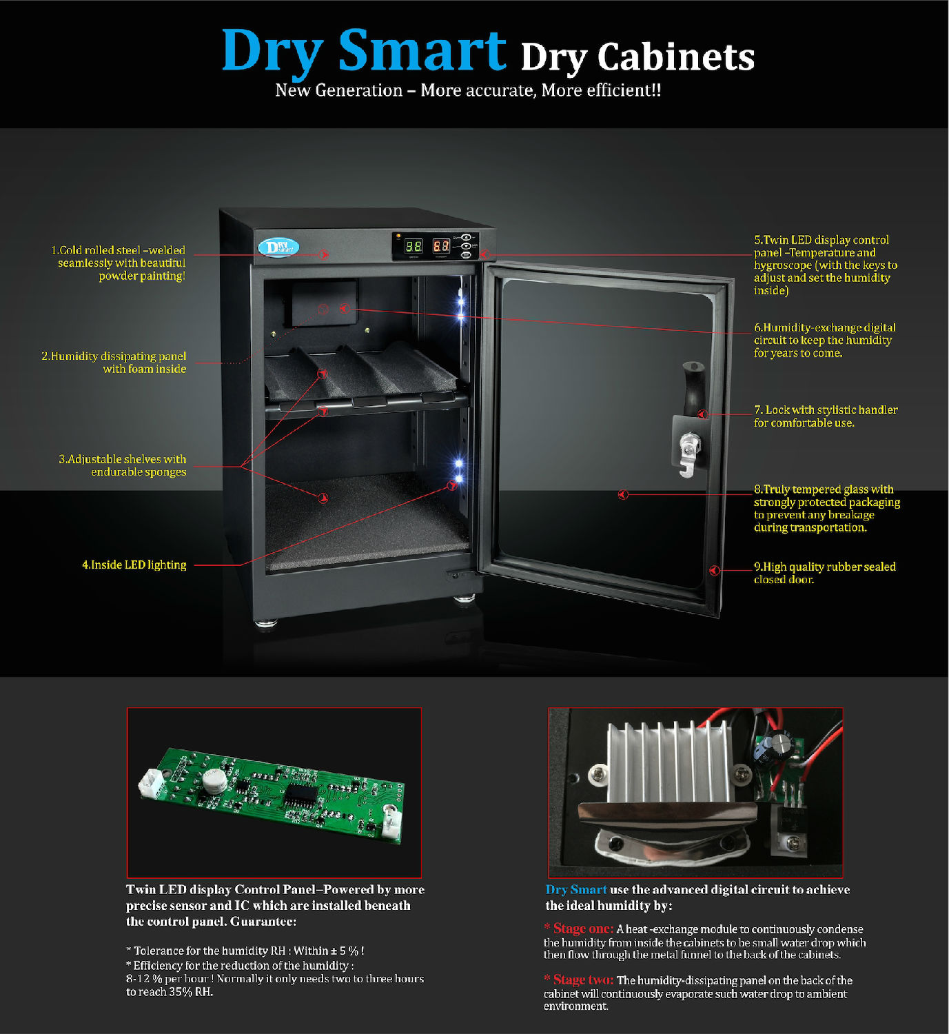 • With patented electronic circuits to remove humidity from the cabinet constantly.