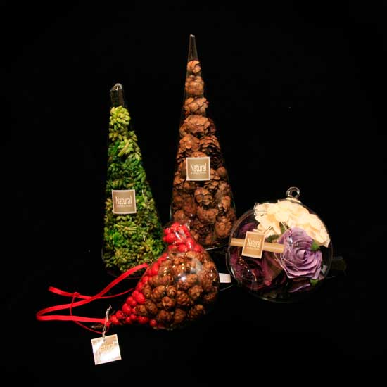 The picture displays a series of dried flower decoration in ball or cone-shape design. The dried flowers and leaves boast vivid colors and exquisite details. Add a sense of refinement to your home with these beautiful dried flower decorations.