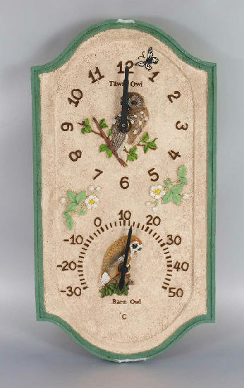• Hand painted clock and thermometer with a barn owl and tawny owl design.