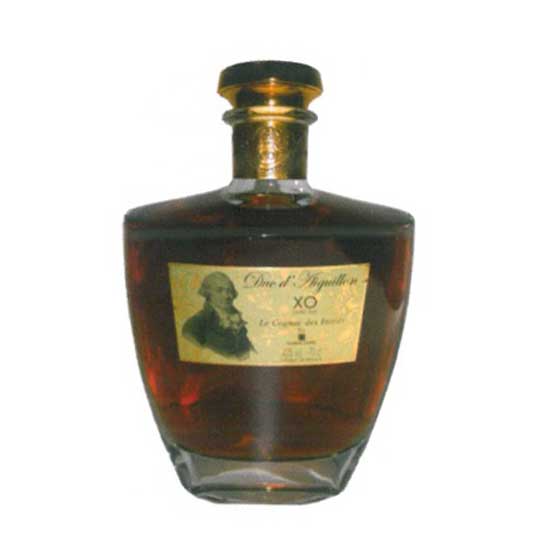 This is a bottle of Duc d'Aiguillon XO by Laurent Jouffe. Made professionally, this cognac has a charming deep amber color. This brandy is packed in an elegant bottle.