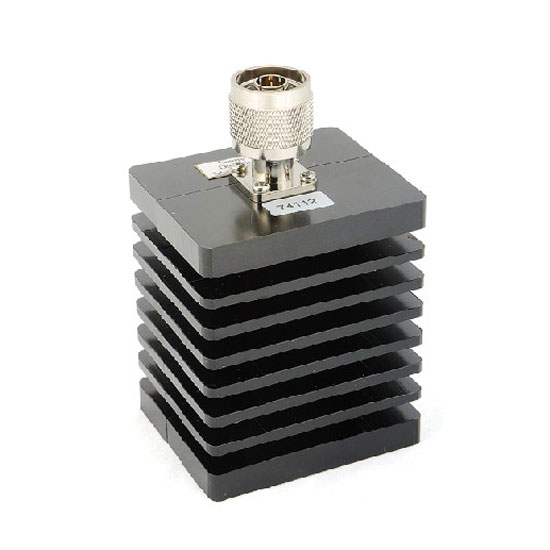 This is a dummy load with excellent performance. It features a black body in a rectangular shape with narrow fins. This dummy load is a great choice for different electrical devices.