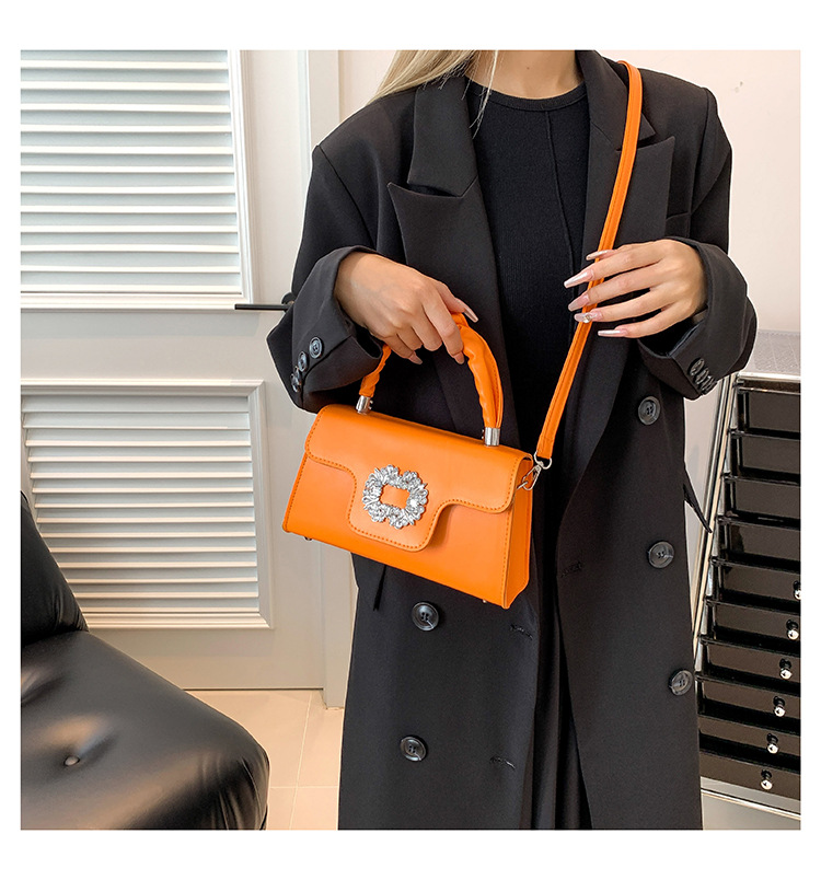 Step into bold, vibrant style with the chic 'Aliya' mini handbag, designed to be the ultimate statement accessory. Each bag is crafted with a smooth, structured silhouette and features a striking, oversized rhinestone buckle on the flap closure, instantly catching the light and adding a touch of glamour. With a palette of eye-catching colors—including vibrant green, classic black, hot pink, sunny orange, and crisp white—these bags are the perfect accessory to inject fun and modern elegance into any look.