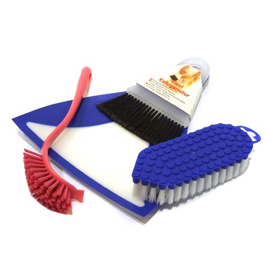 As shown is a dust pan set including brushes, brooms and a dust pan. Made of quality plastic, this mini dust pan set is known for its durability and toughness. This dust pan set looks cute yet practical.