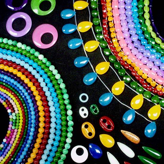These are a wide range of dyed white quartz for jewellery making. The quartz pieces are dyed with different colours, such as red, blue, green, yellow and pink. They are available in various sizes and shapes like coin, drop, heart, round and oval.