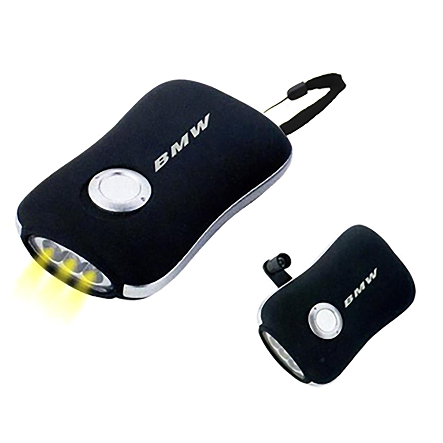 The dynamo flashlight is installed with three LEDs inside a robust plastic housing. A cranking wheel is located on the right for easy operation. 30 minutes of full illumination will be produced after hand cranking for 1 minute, resembling as a funny promotion product.
