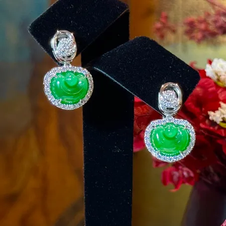 These stunning earrings feature two highly translucent, luminous green jadeite cabochons, carved into a delicate, rounded shape. Each jadeite is encircled by a brilliant diamond halo, with a stylized diamond loop connecting it to the ear. The design perfectly balances the rich, organic beauty of the jadeite with the radiant sparkle of the diamonds.