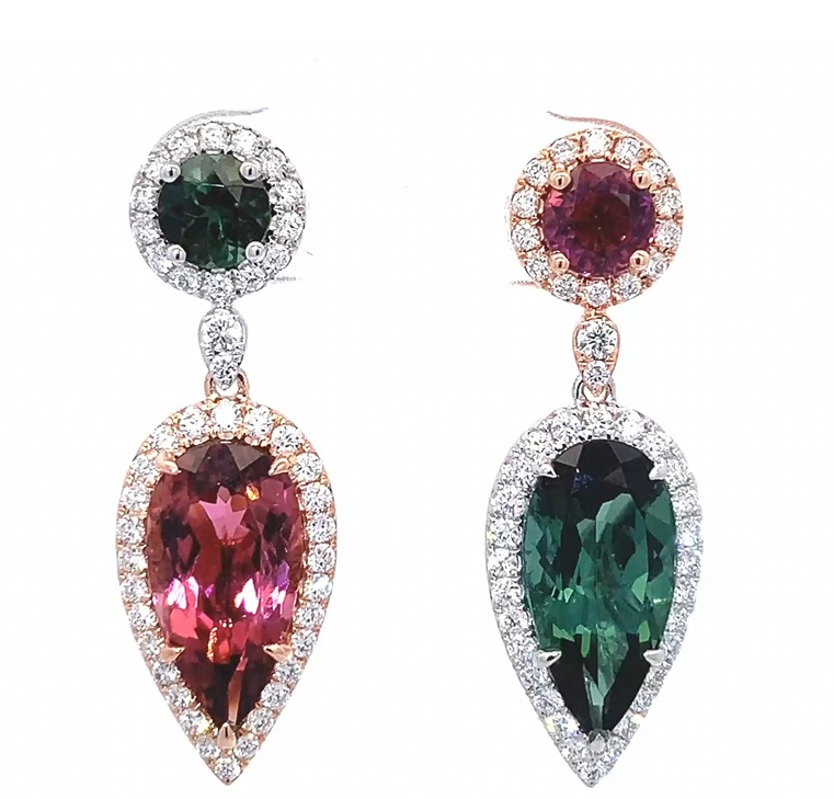 18K WHITE AND ROSE GOLD PINK TOURMALINE, GREEN TOURMALINE AND DIAMOND EARRINGS