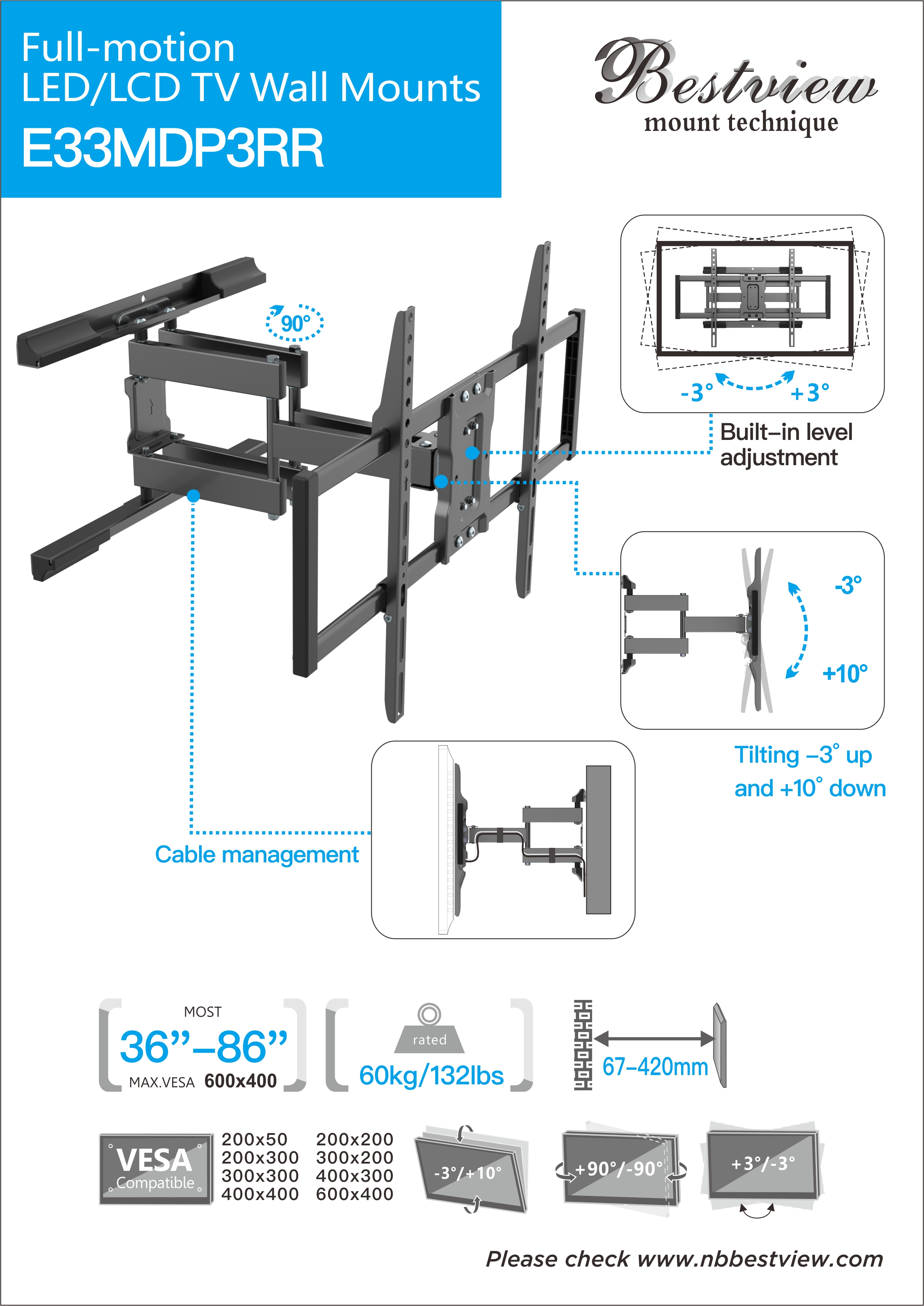 Standard VESA(Max VESA 600X 400) with 60 kgs weight capacity,Safe,easy load and nice disign