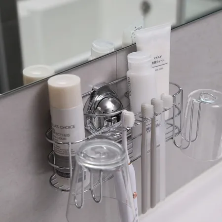 This toothbrush holder with strong suction cup is made of 304 stainless steel. It is convenient to store toothbrush 6pcs, 2 cups, toothpaste, facial cleaner and keeps the environment tidy and help the bathroom storage.