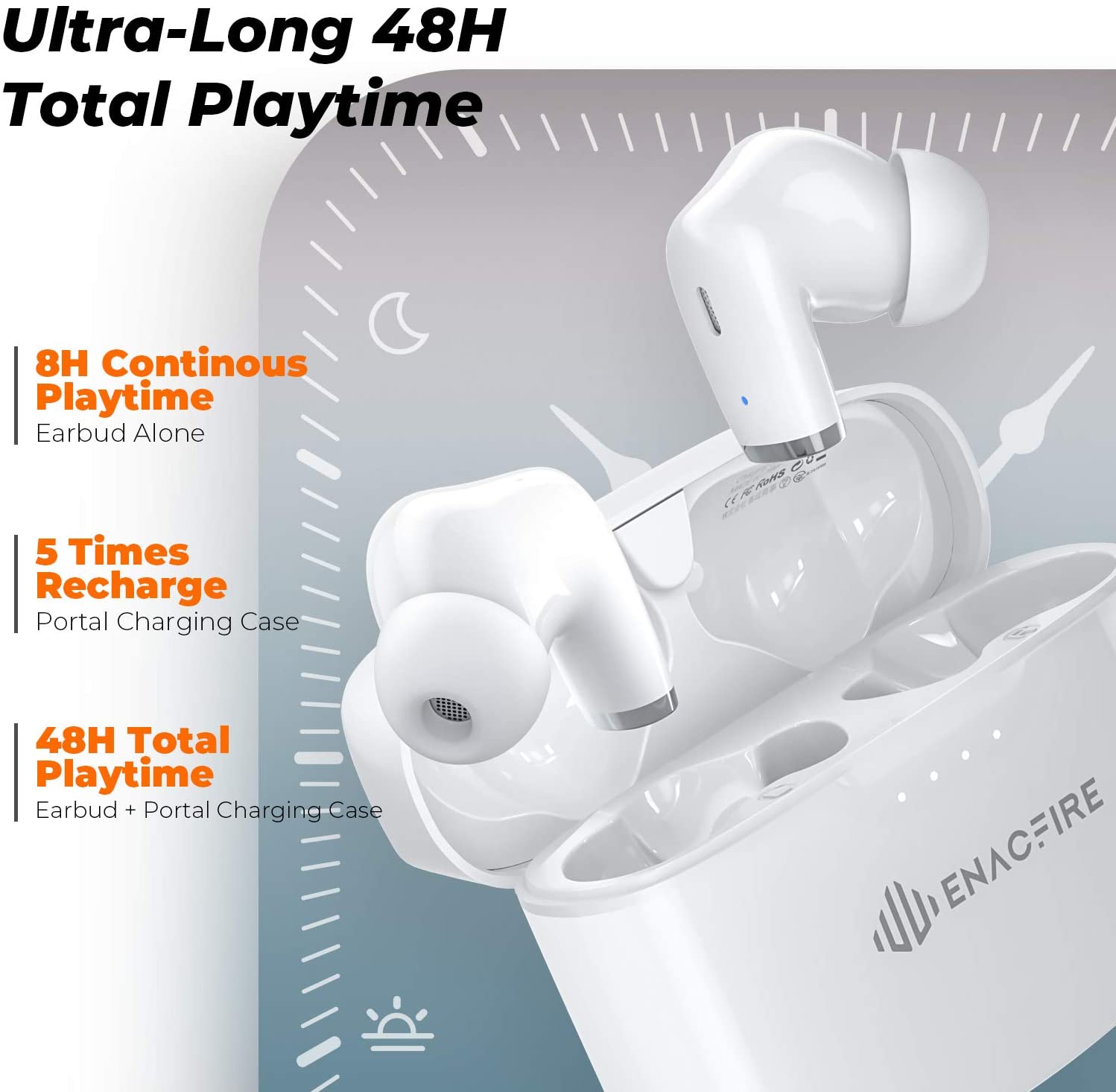 【FACE-TO-FACE PHONE CALL QUALITY】 Difficult to have a proper phone conversation by using wireless earbuds? Try ENACFIRE E90 Bluetooth earbuds! Leave only the 2 fine-adjusted mics installed on earbuds, the passive noise cancellation design can block out the noise greatly. Give you the real best experience of hands-free calling.