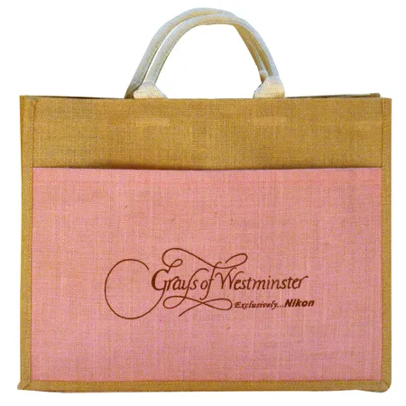 Standard Jute Shopping Bag with front pocket having hook and loop tape closure.
