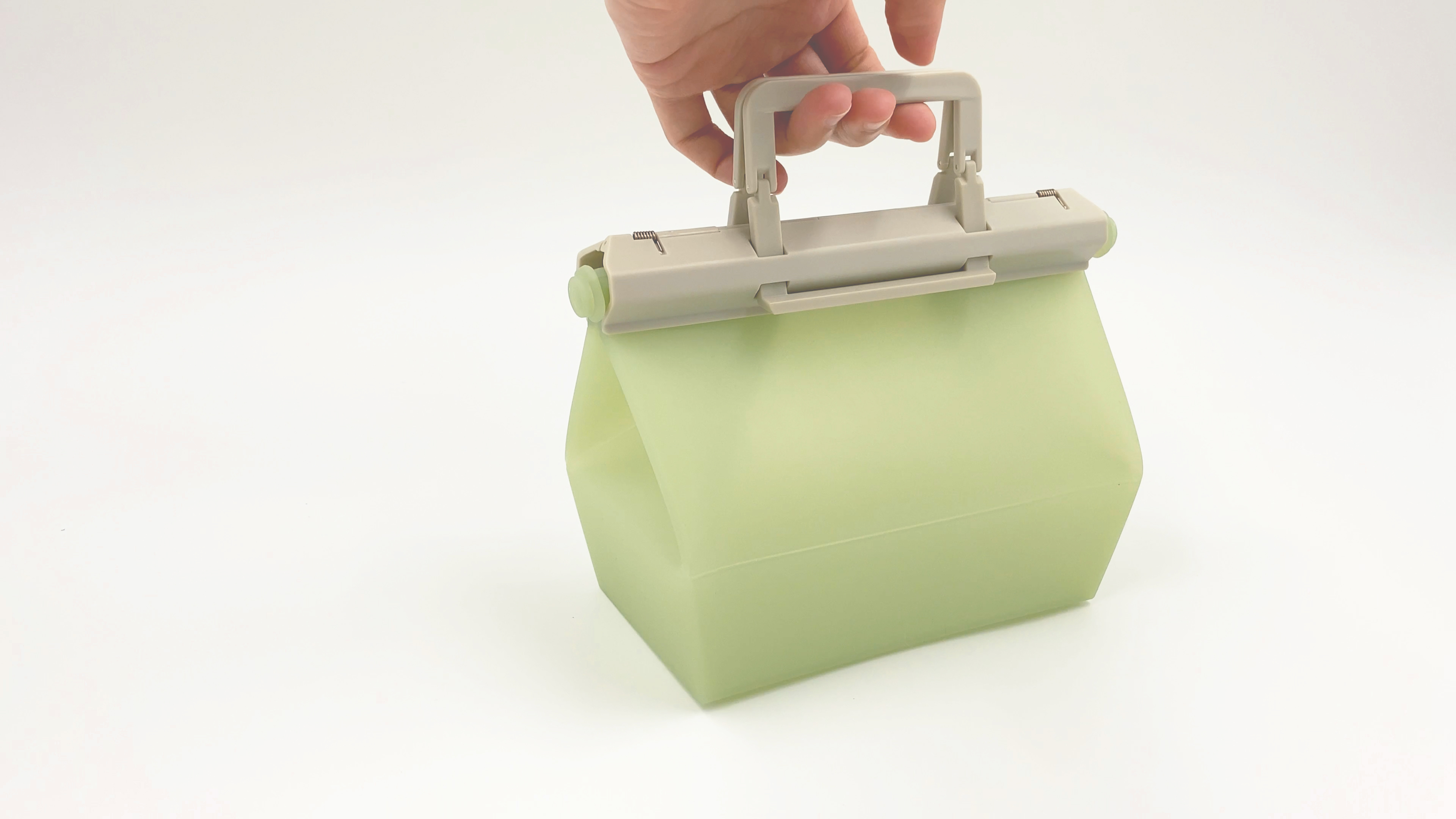 Food-grade silicone food bag / lunch box / meal container with a recycled plastic handy clip