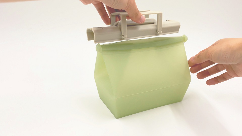 Food-grade silicone food bag / lunch box / meal container with a recycled plastic handy clip