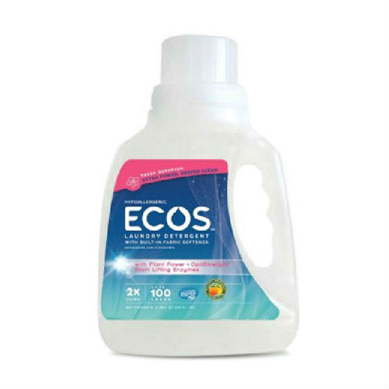 ECOS Laundry Detergent in new fresh Geranium scent. Powerful enzymes deep clean, lifting stains as they work their way through fibers. Hypoallergenic and built-in softener.