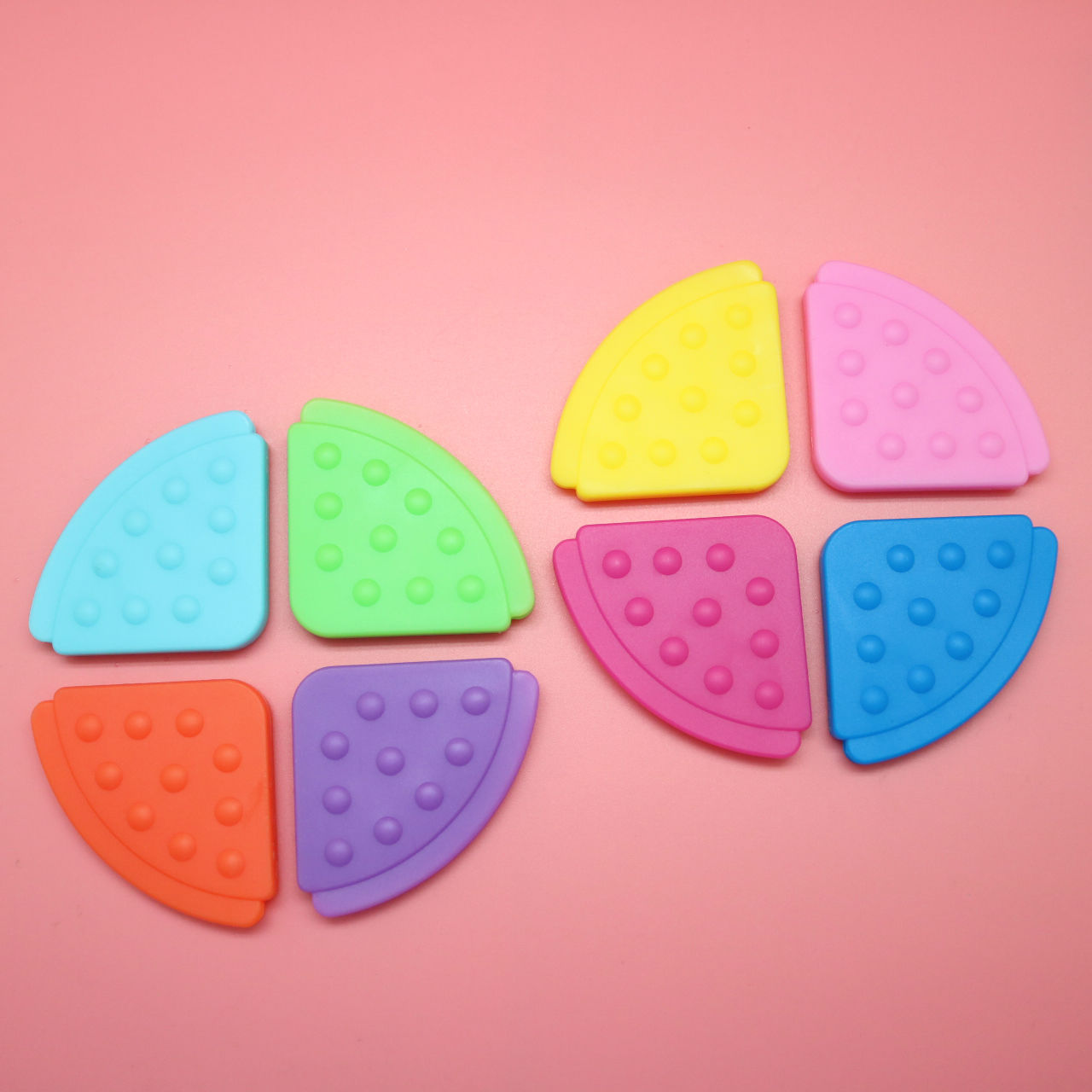 This is a baby teether that comes in a triangular shape. Made of safe plastic, this teether is soft and suitable for chewing. This high quality baby teether is also easy to clean.