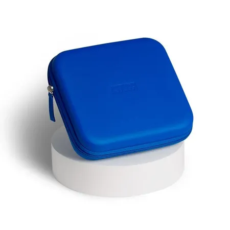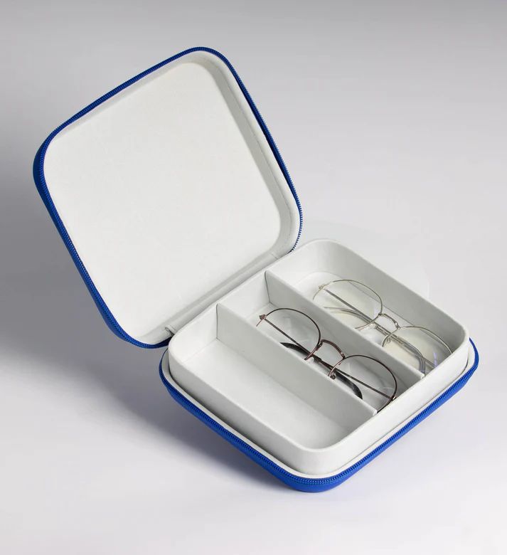 Keep your eyewear safe and stylish with our travel case designed to hold up to three pairs of glasses. The exterior is crafted from durable blue PU, while the interior features soft gray suede to protect your frames. With rounded edges and a lightweight design, this case is both practical and elegant. The easy-to-open nylon zipper ensures quick access, making it the perfect travel companion for your eyewear.