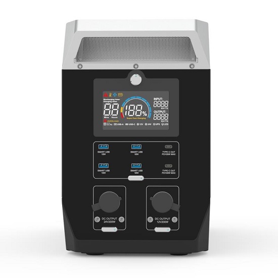 1. EZ2400 portable power station has 2000Wh lithium battery pack and 2400W pure sine wave inverter, with versatile output ports including AC, DC, USB, TYPE-C and Cigarette Lighter outlet to fulfill the needs of appliances at home or electric and electronic devices in outdoor settings, workable with portable solar panel as the solar energy storage system, the built-in BMS provides high security protections, and comply with CE, RoHS, FCC, UL, PSE and UN38.3 certifications.