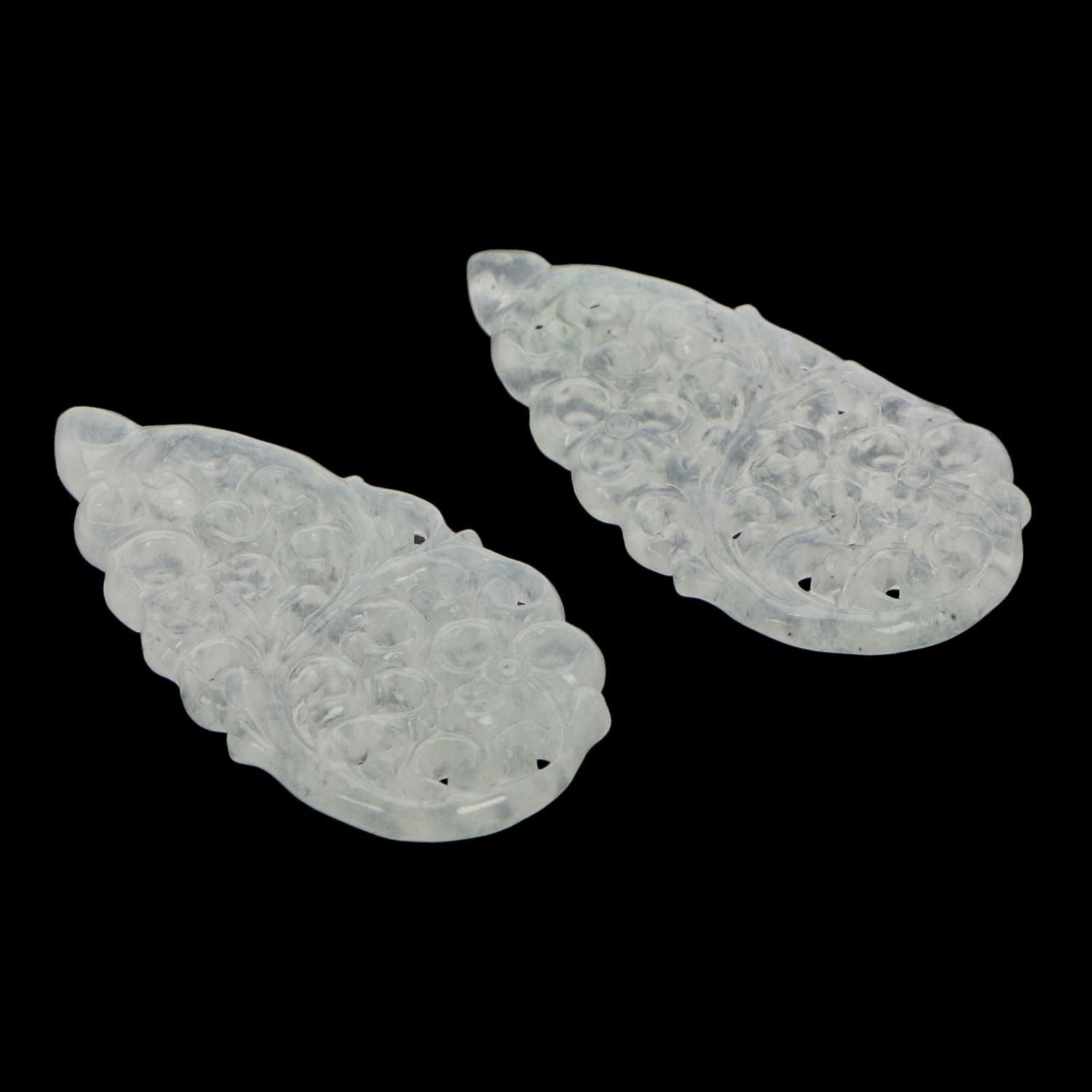 Featured here is a paired of handcrafted earrings made of natural type A white jadeite jade. It comes in pear shape and is decorated with elegant swirl patterns. This pair of earrings is a great accessory for all occasions and can pair well with different outfits.