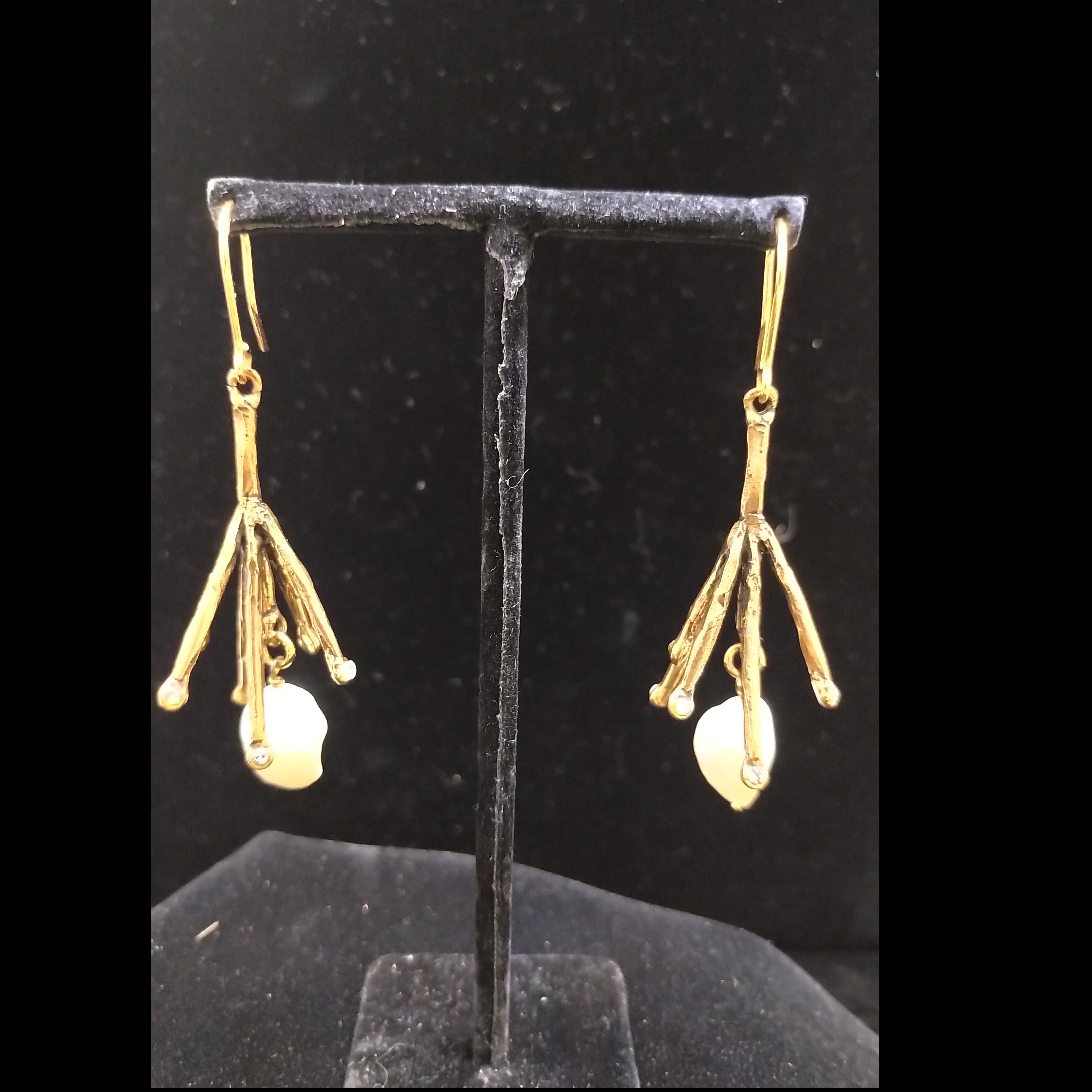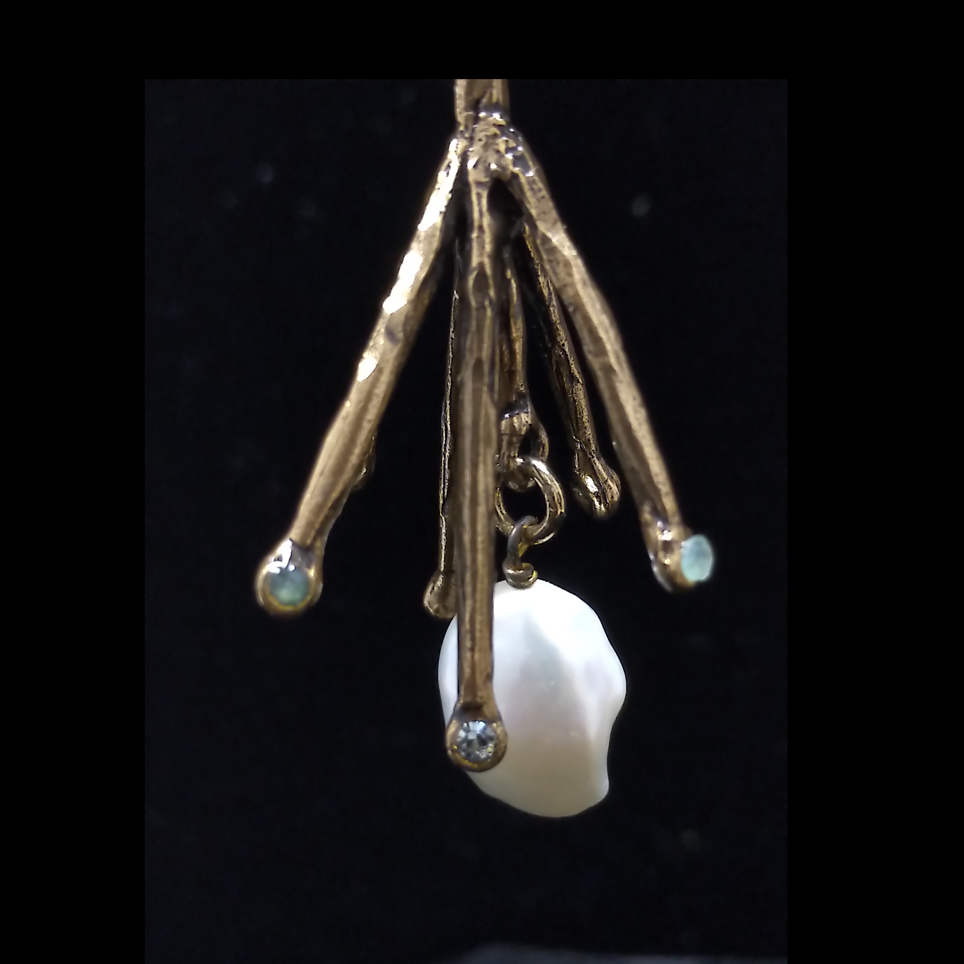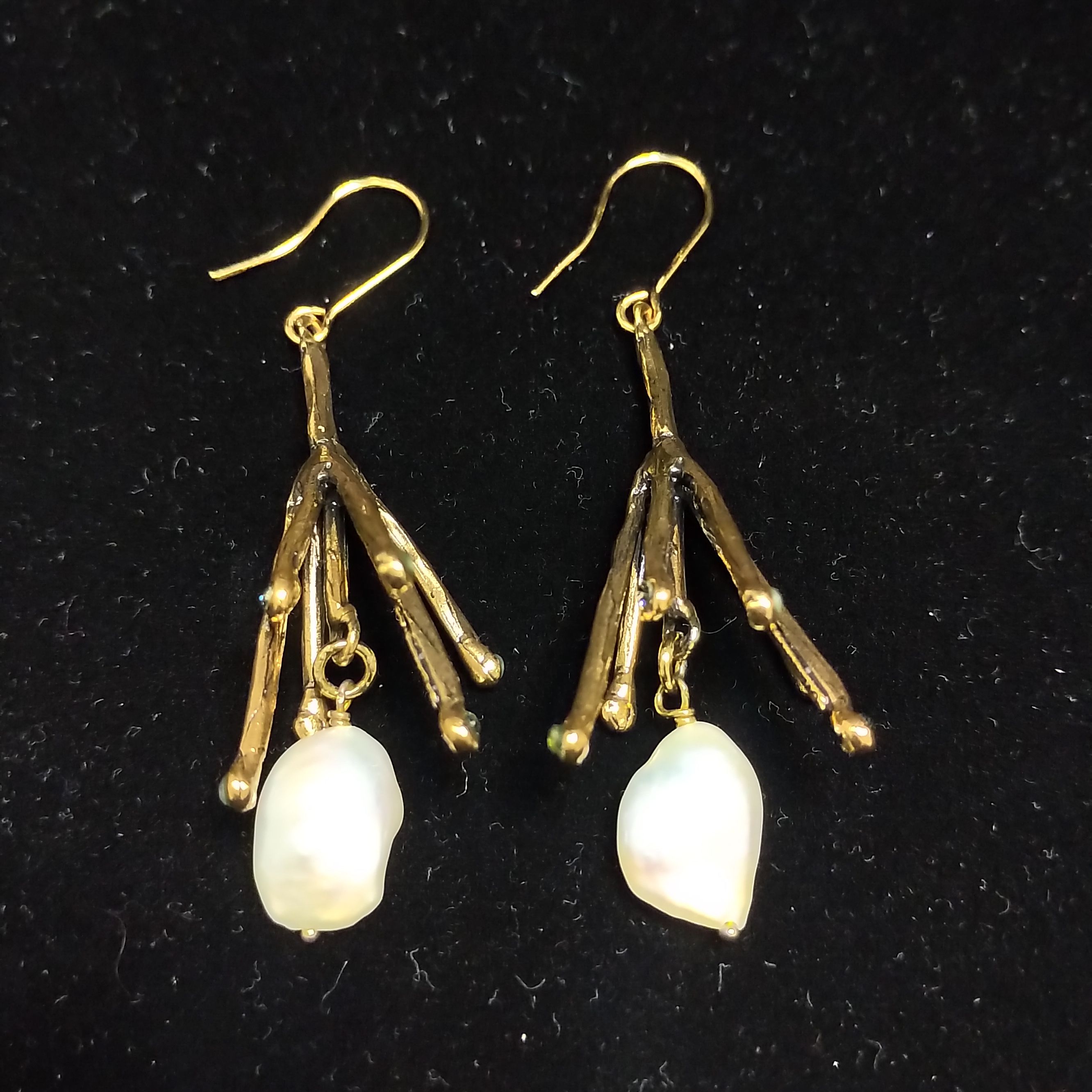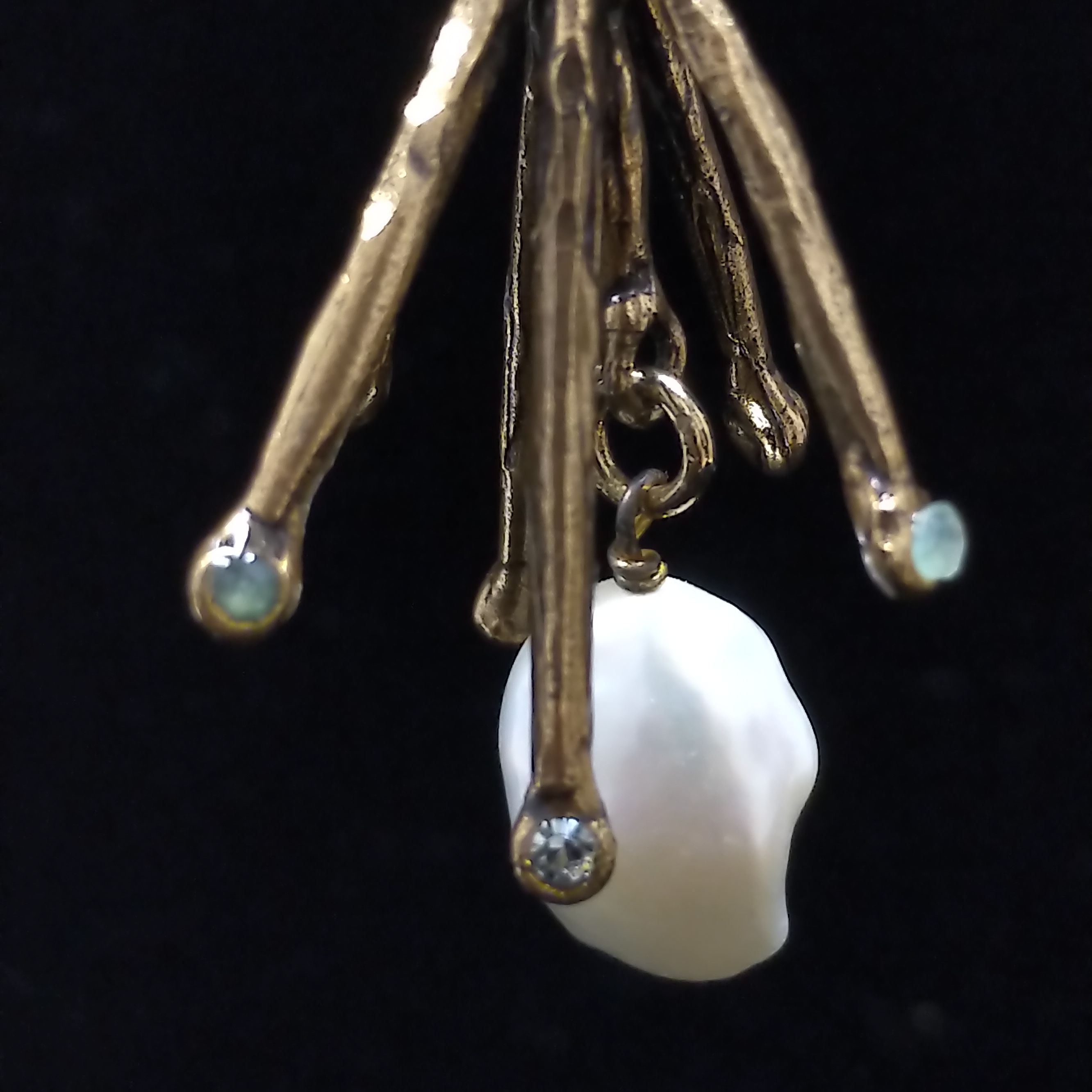 Earrings of gold-dipped brass with marine plants & crystals and hanging pearls
