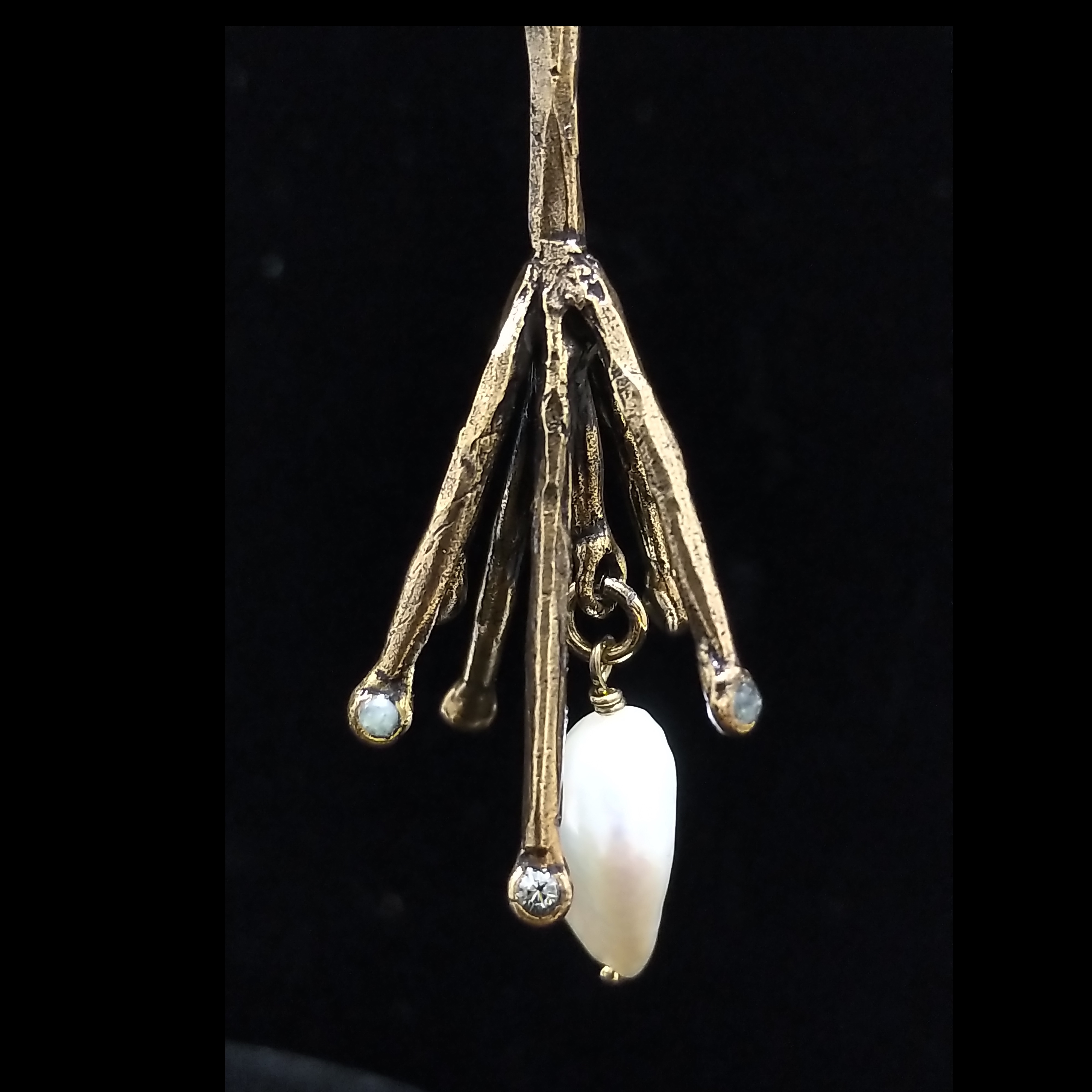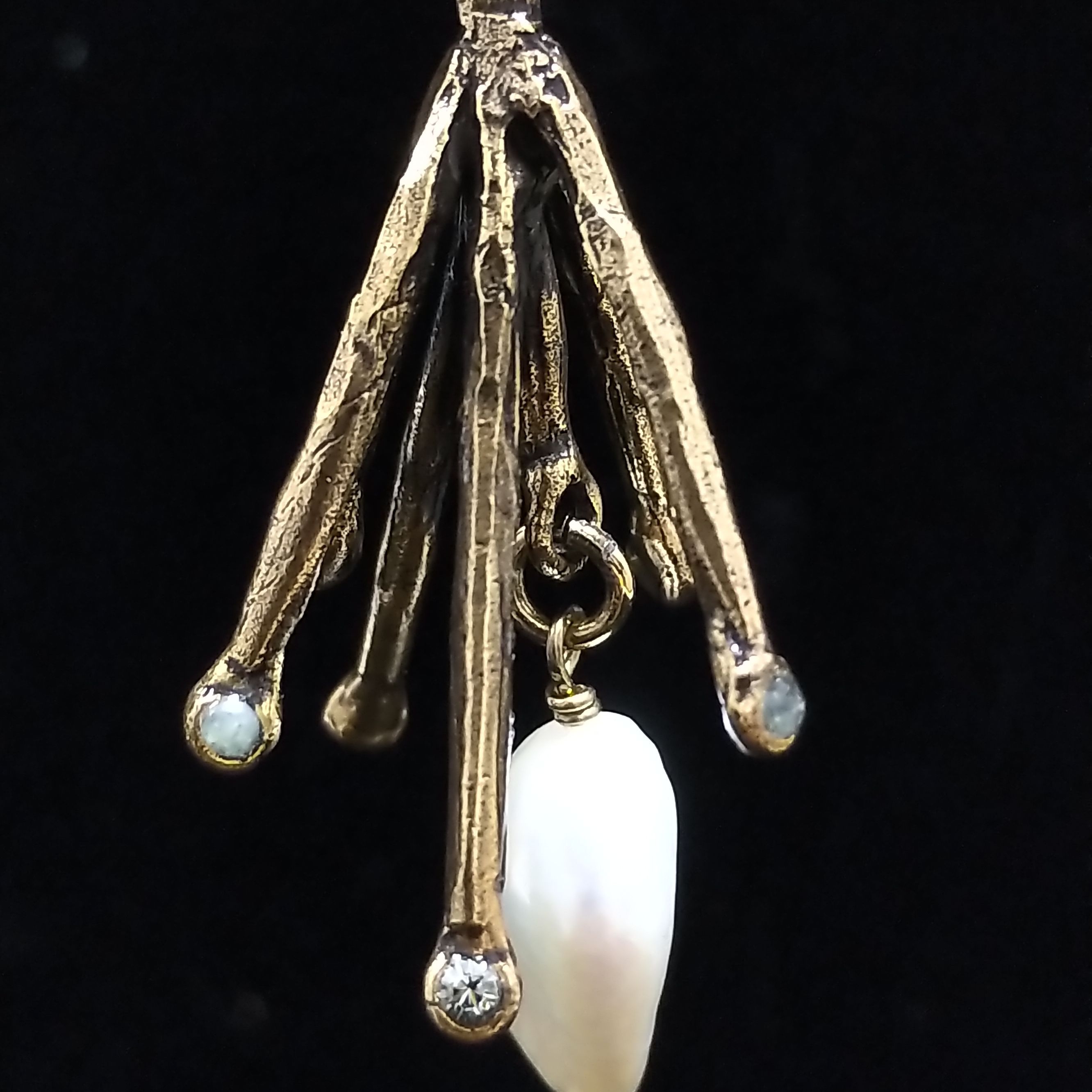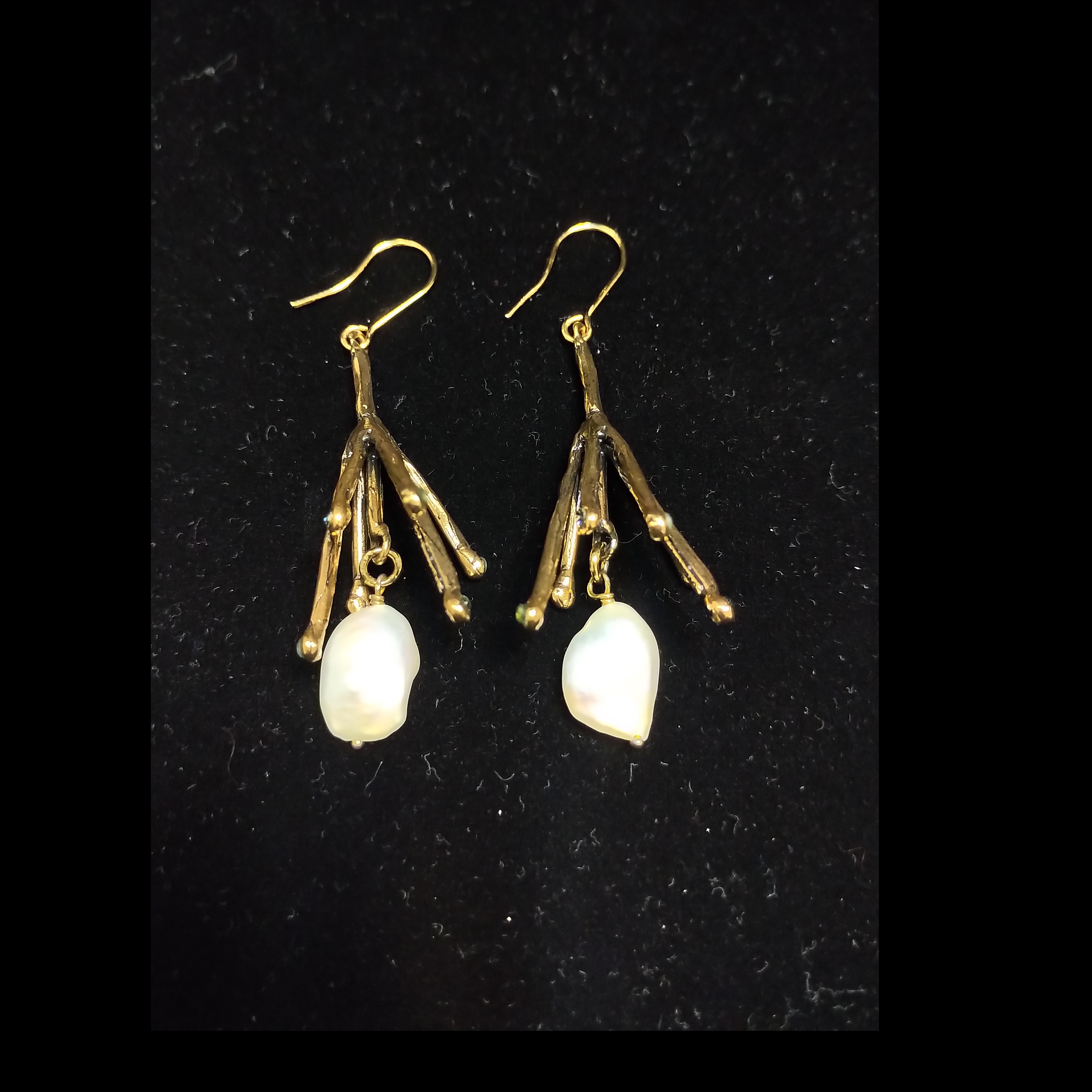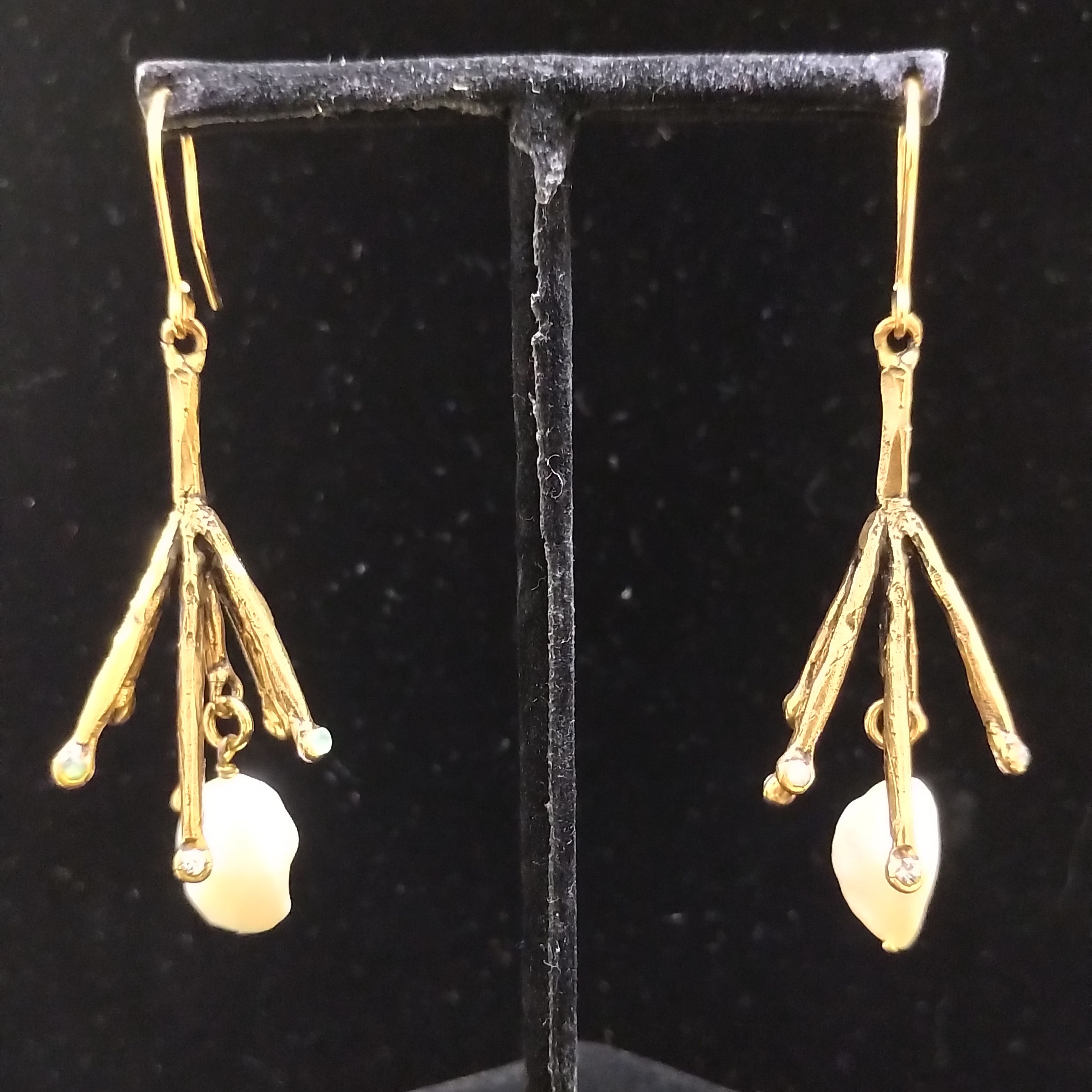 Earrings of gold-dipped brass with marine plants & crystals and hanging pearls