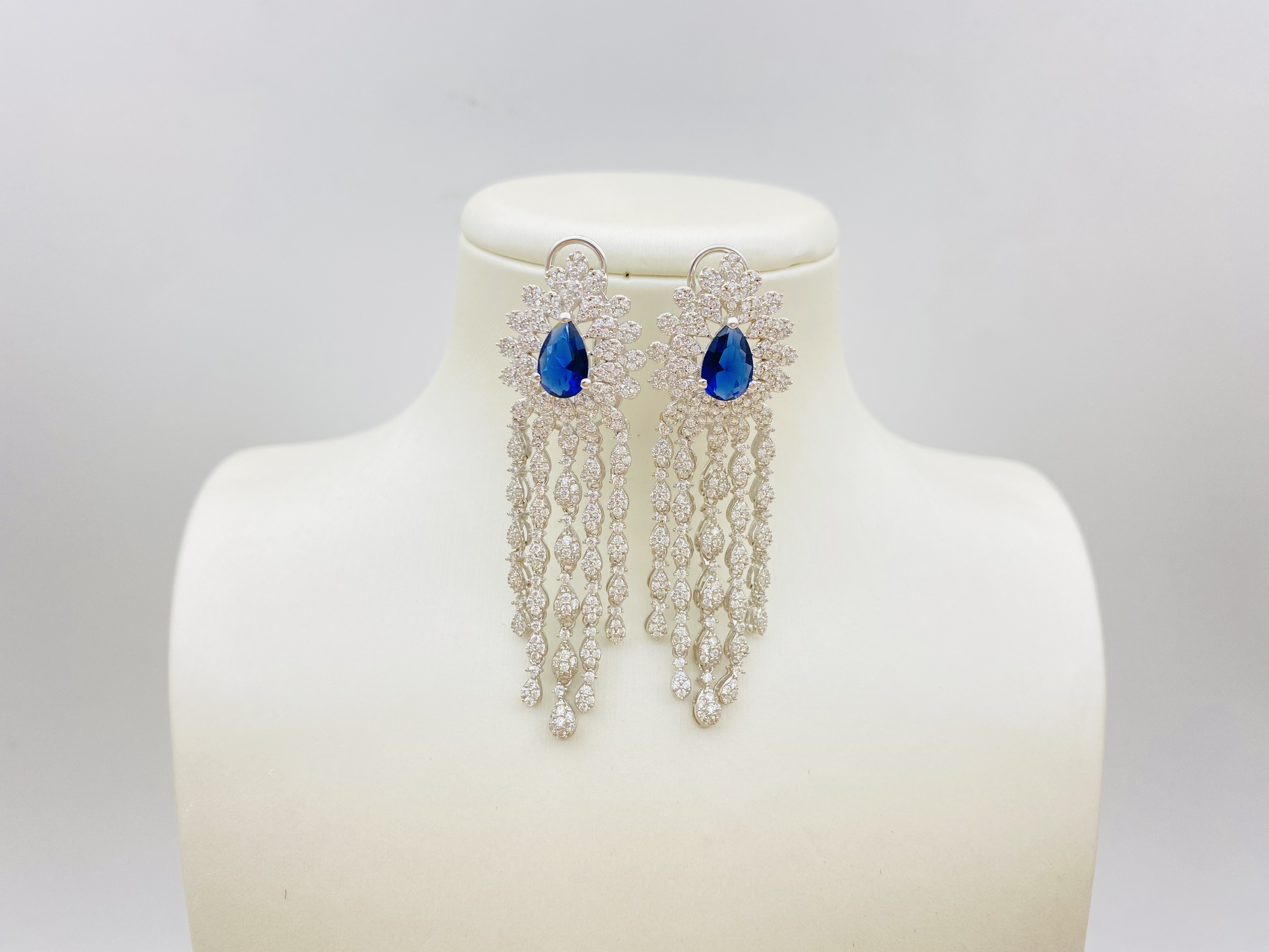 Indulge in luxury with these stunning chandelier earrings. At the heart of each earring is a captivating teardrop - shaped blue gemstone, exuding an air of elegance and mystery. Surrounded by a cluster of shimmering crystals, they create a dazzling focal point. The cascading rows of crystal droplets add a touch of glamour and movement, making these earrings perfect for special occasions. Crafted with meticulous attention to detail, they are not only a piece of jewelry but a statement of style and sophistication.