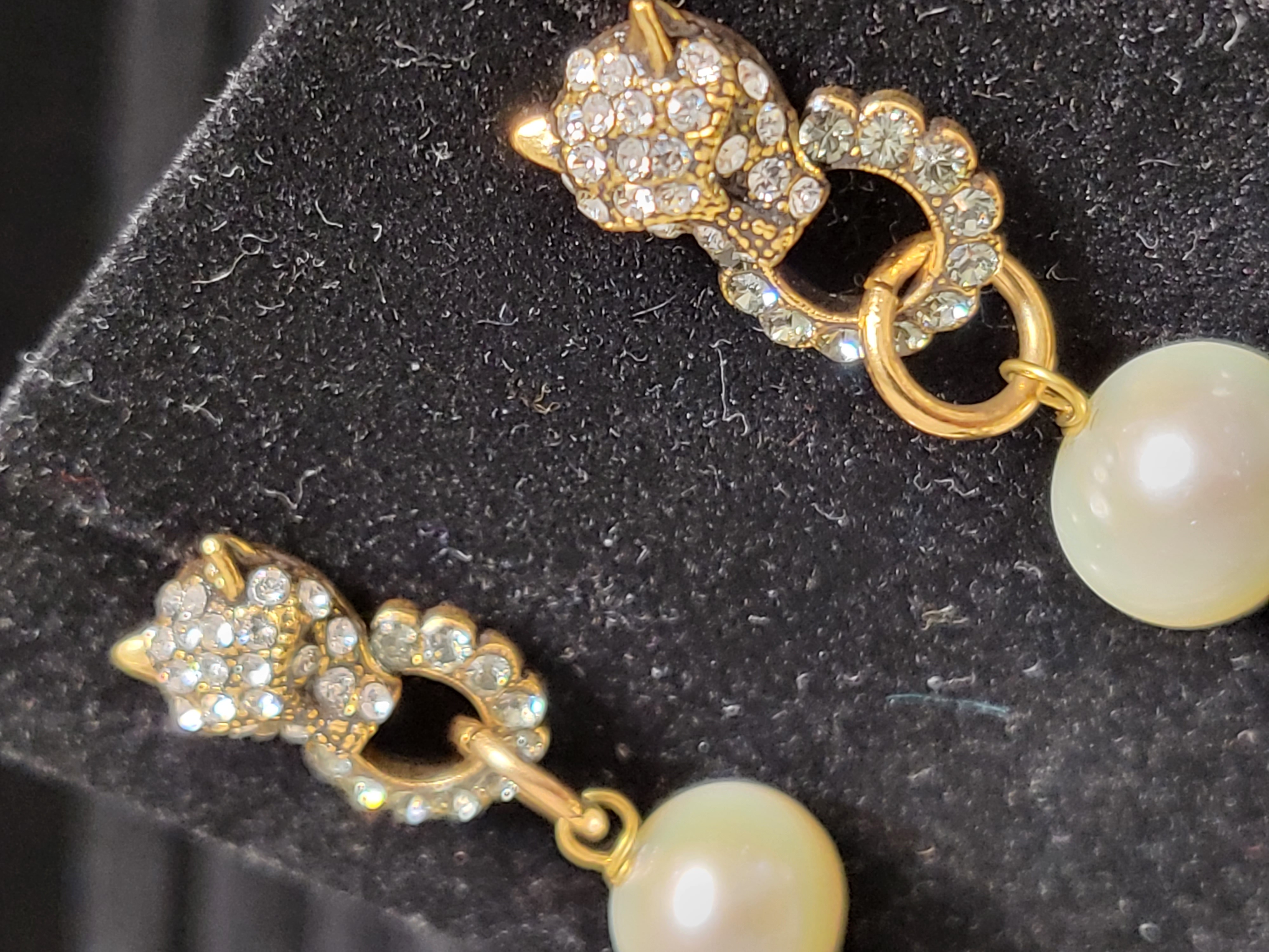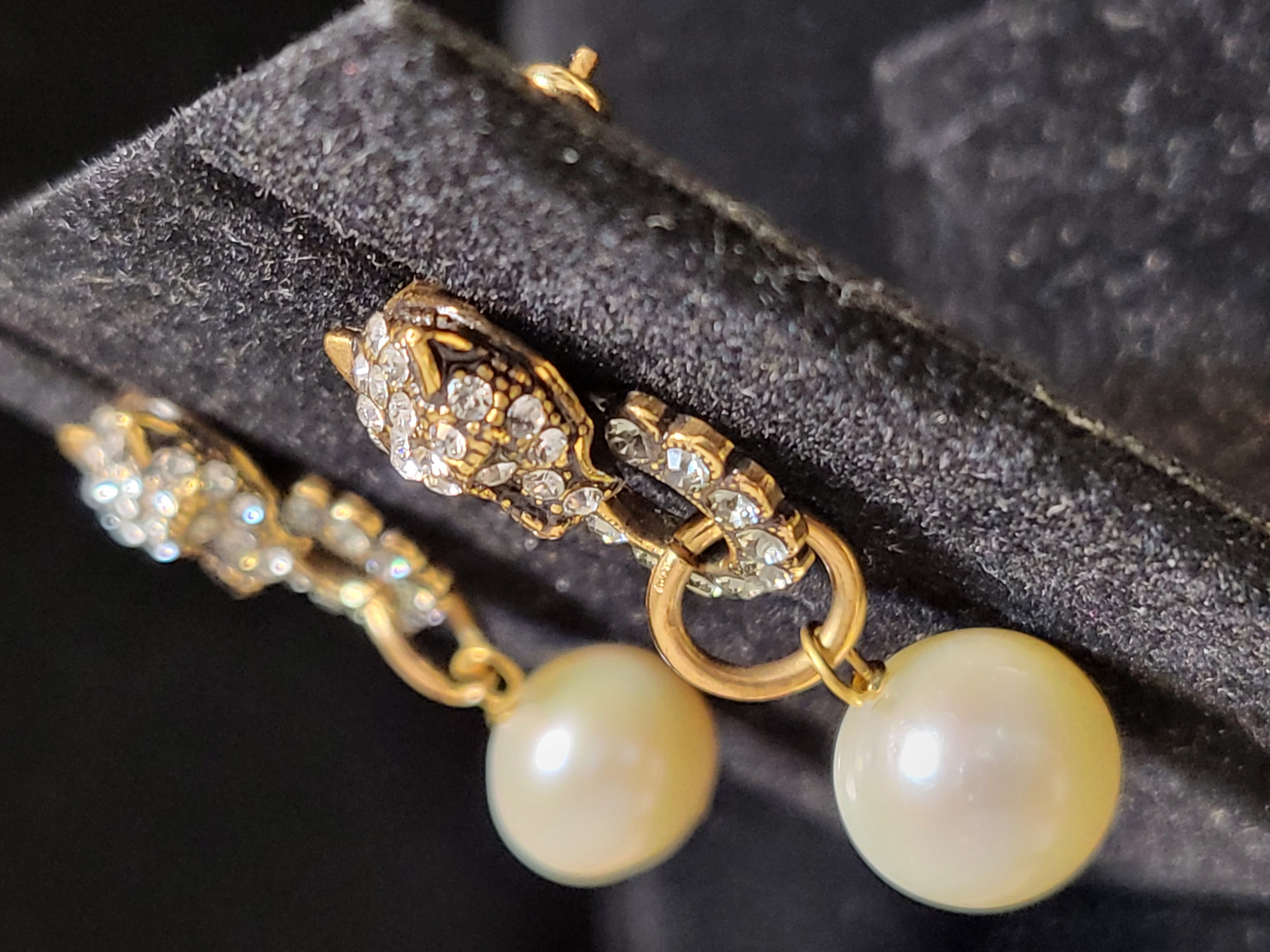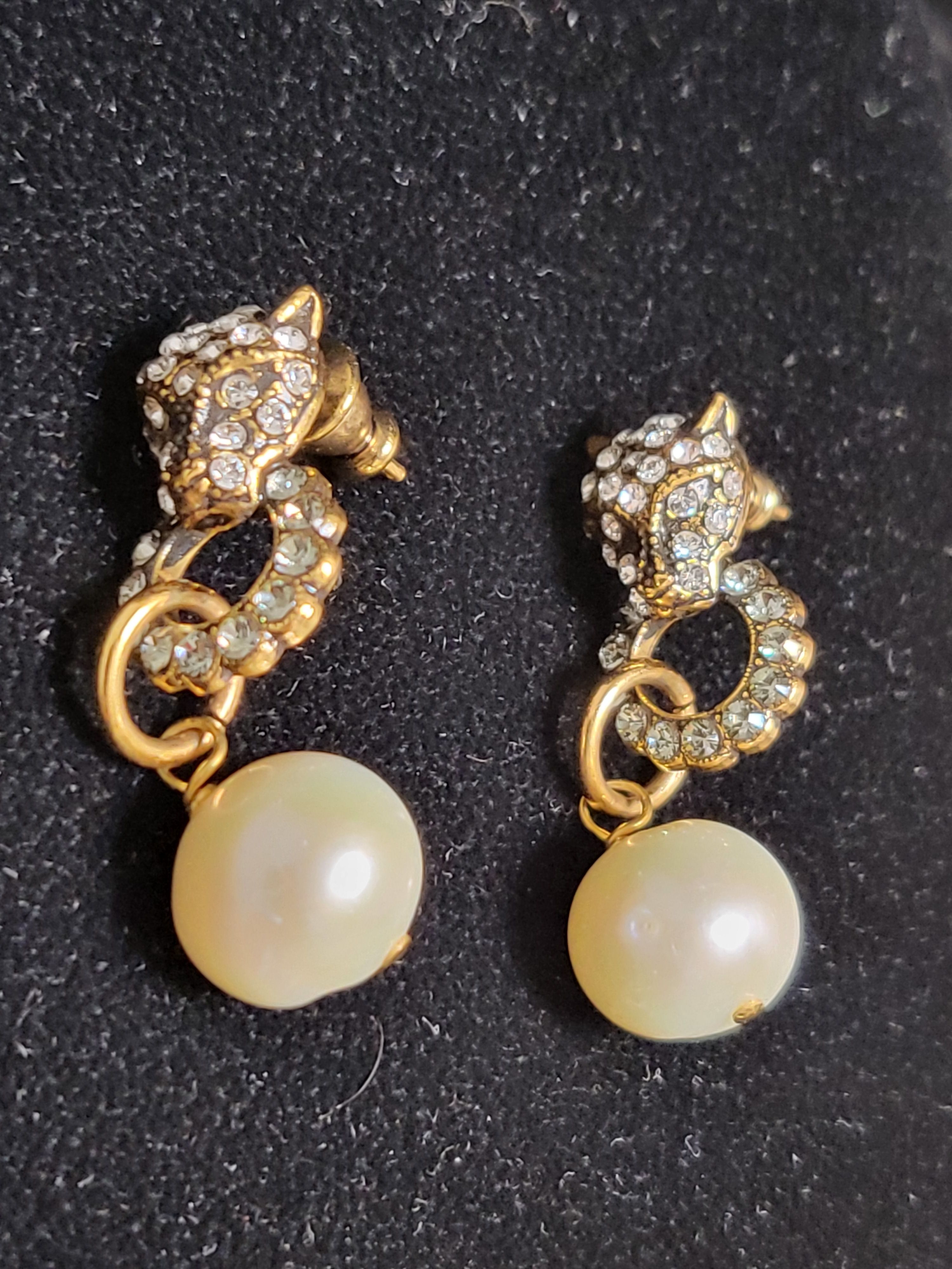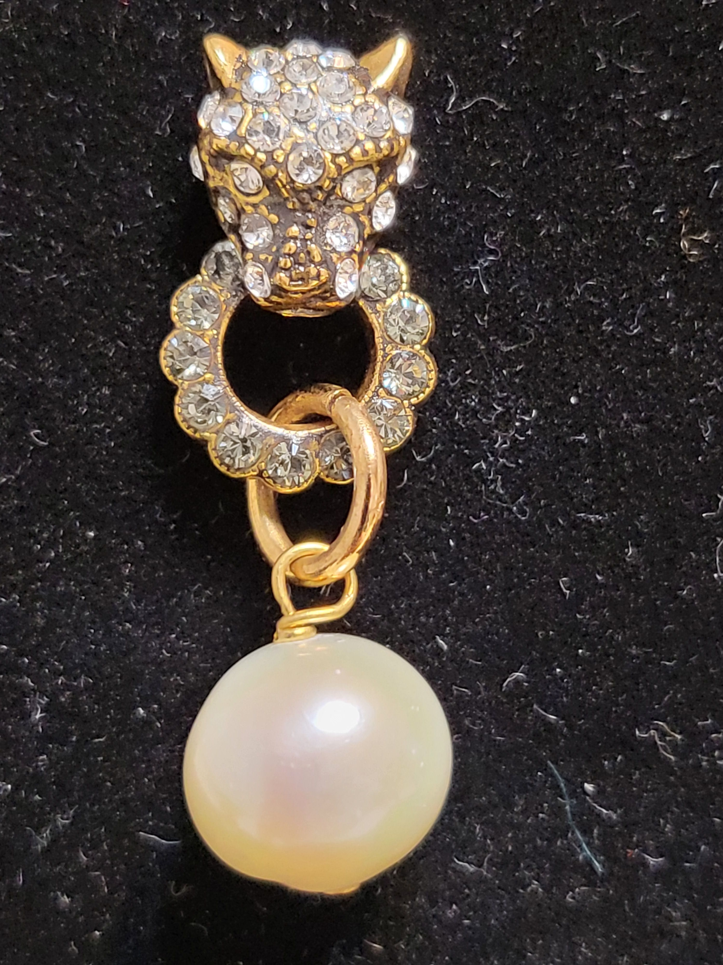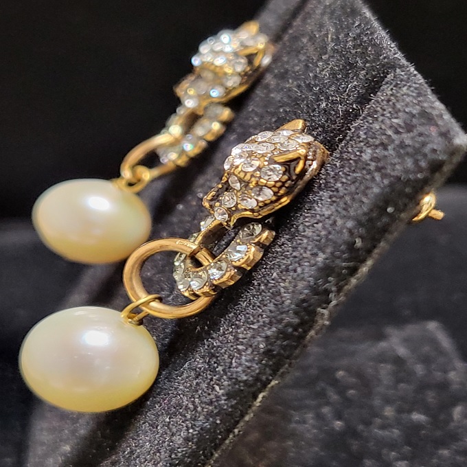 - Pierced earrings in gold-dipped brass with panther head adorned by swarovski and hanging pearl.