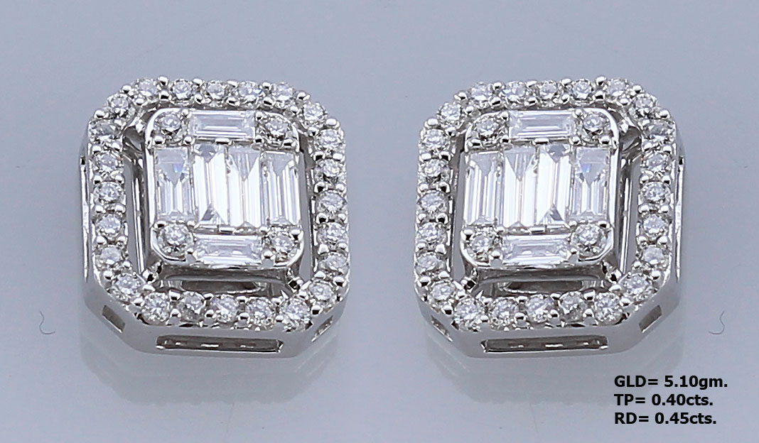 • A Pair of 18kt Gold Earrings studded with Fancy cut diamonds to give a look of a Emerald Cut Solitaire.