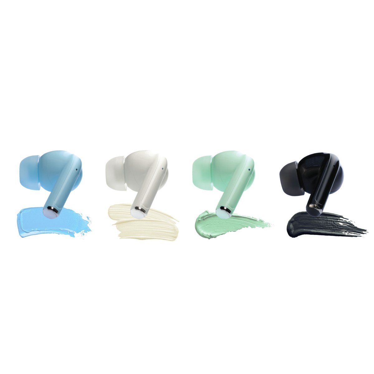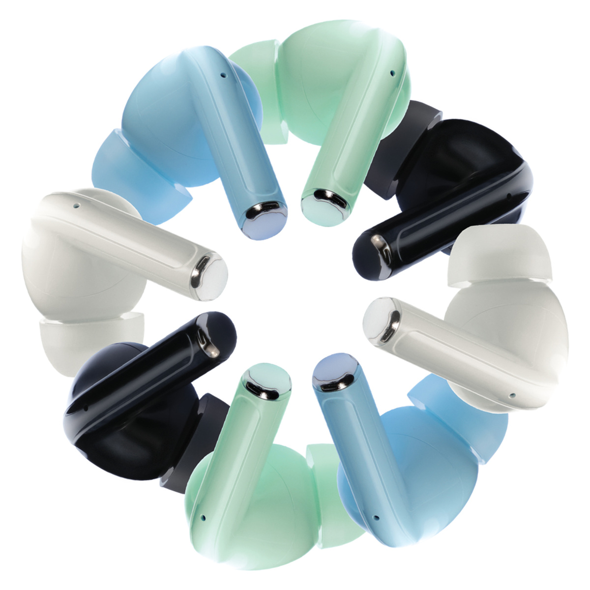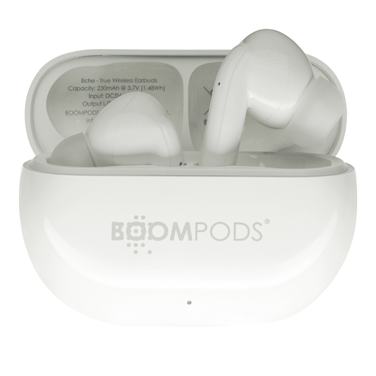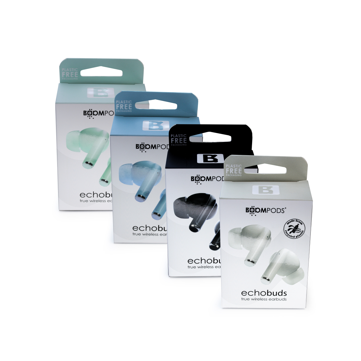 Introducing Echobuds, the eco-friendly true wireless earbuds made from recycled plastic. Packed with powerful drivers that deliver impressive bass, these vibrant, colourful, pick-up-and-go buds provide convenience, style, outstanding audio performance, and a built-in mic for calls, perfect for your everyday adventures.