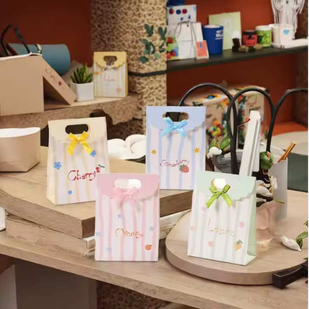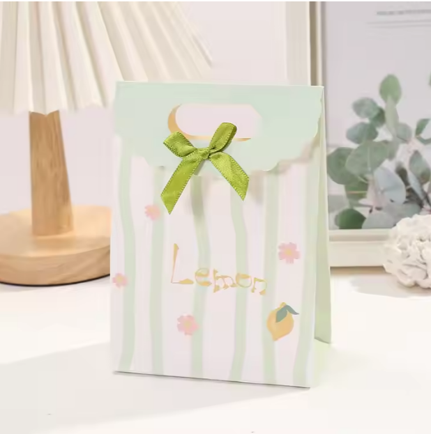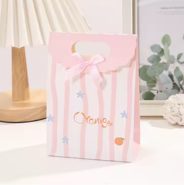 Eco-Friendly White Kraft Paper Handbag Cartoon Stripe Bow Design Recycled Materials Used for Desserts Face Masks Gift Cardboard
