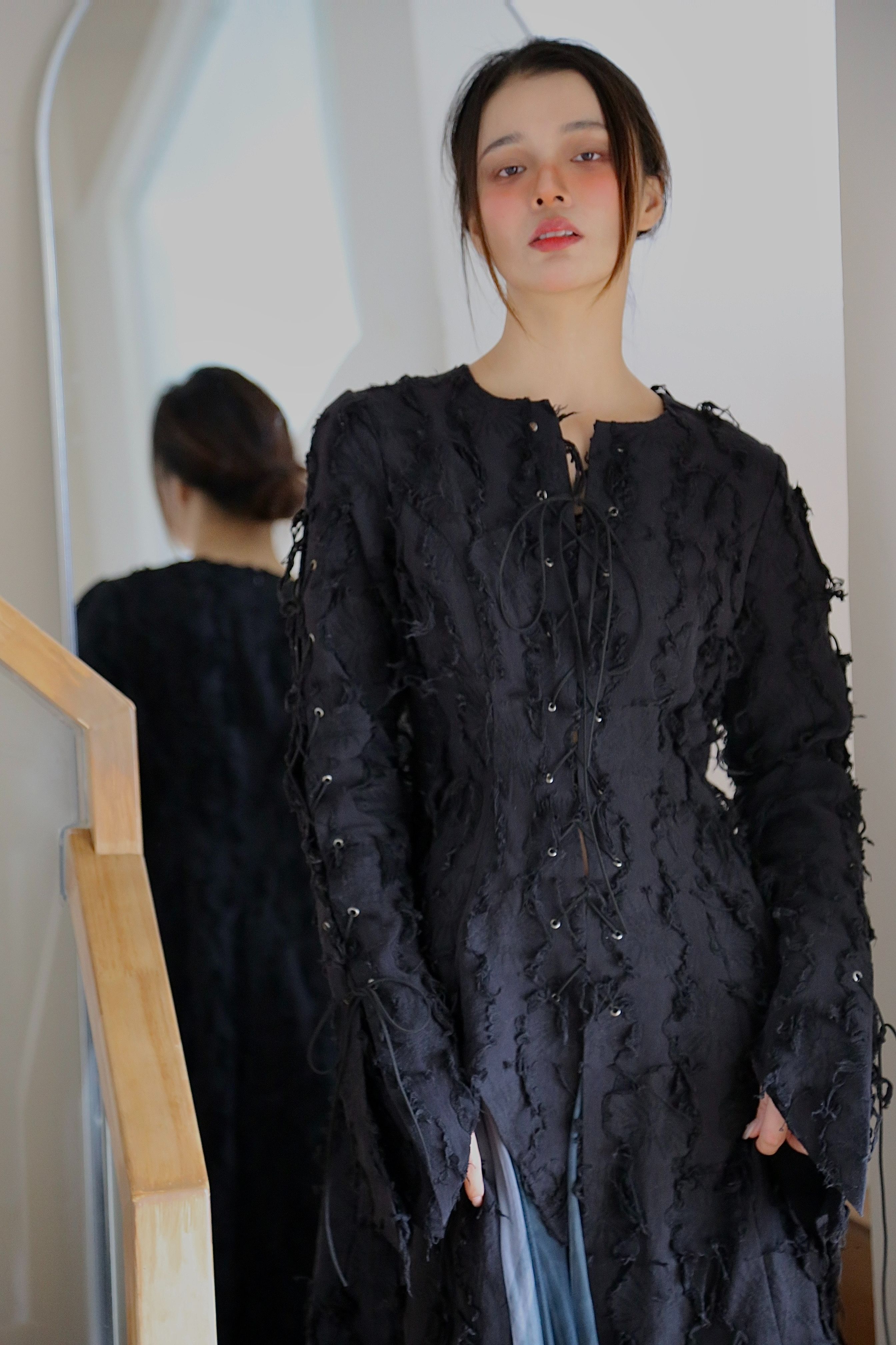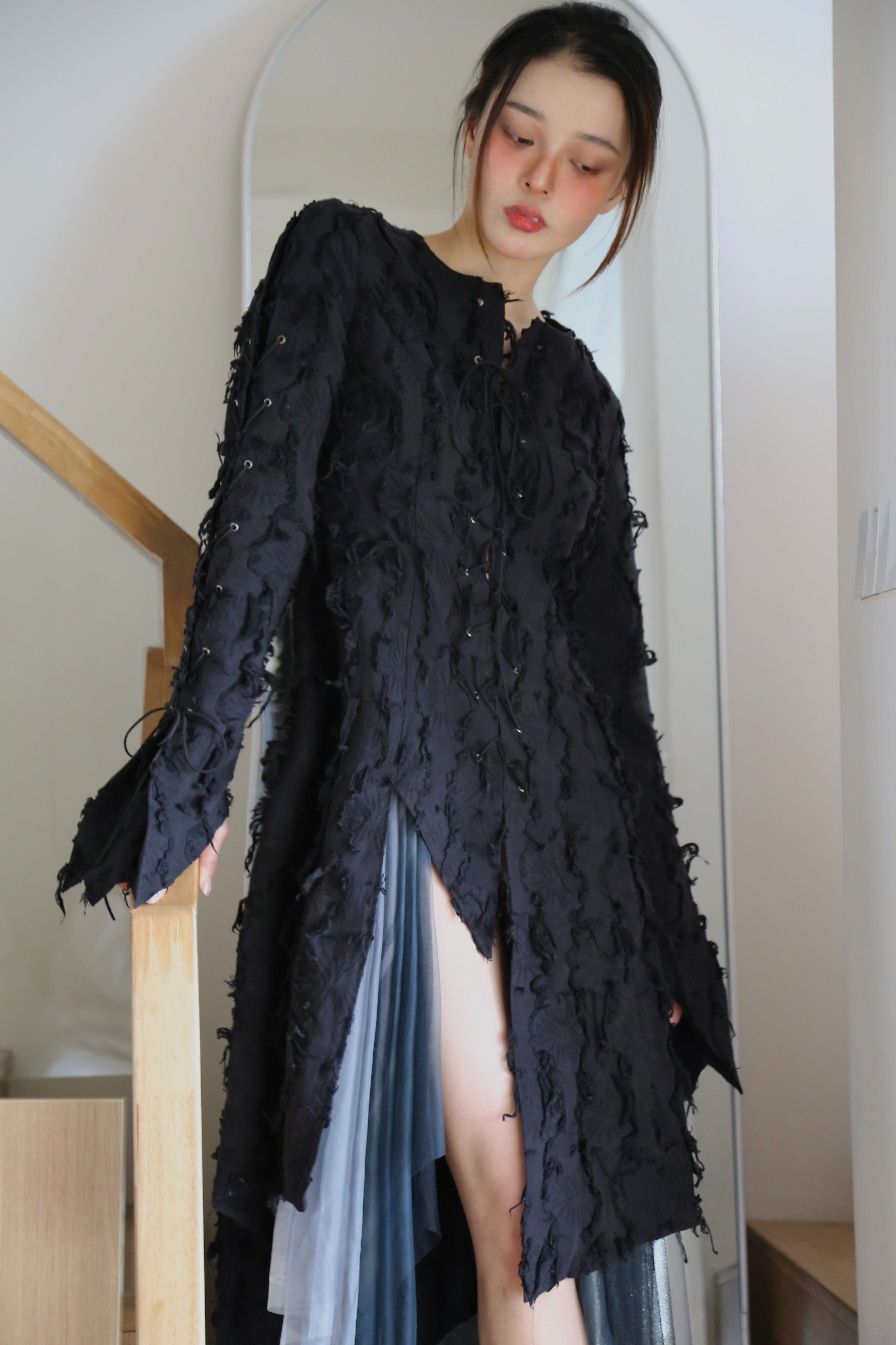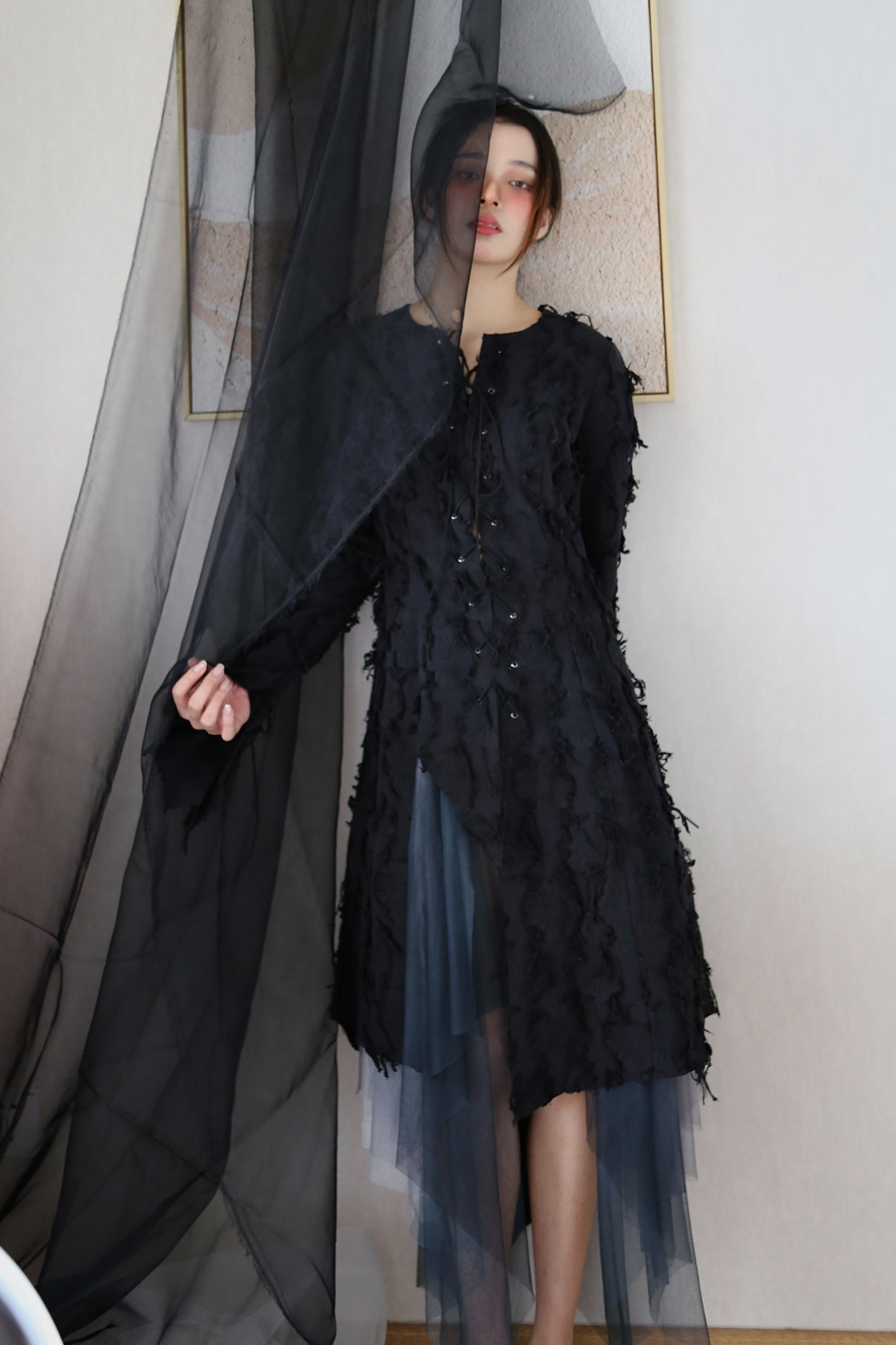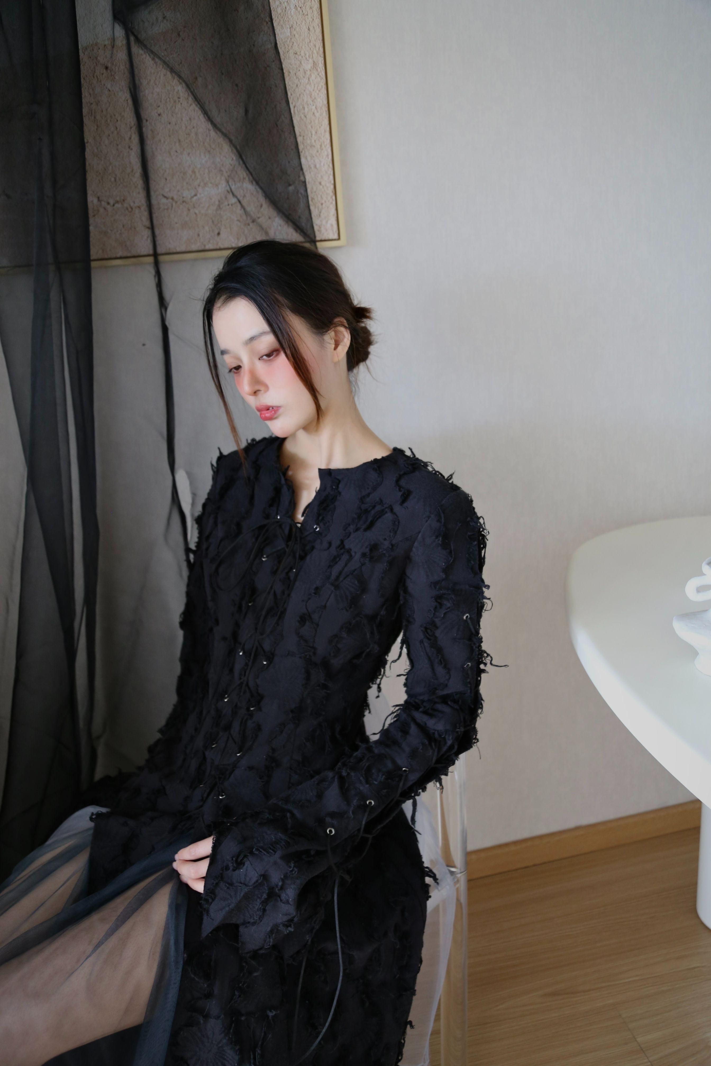 Front strap+slit design, paired with metal eyelets on flared sleeves, comes with adjustable styling tension; The outer layer of fringed fabric has a strong texture, while the inner layer of gradient mesh skirt is faintly visible, forming a dynamic layer of virtual and real interweaving between walking. Can be worn alone to create a dark look, or layered as an outerwear, balancing the sense of ceremony and versatility in multiple scenes