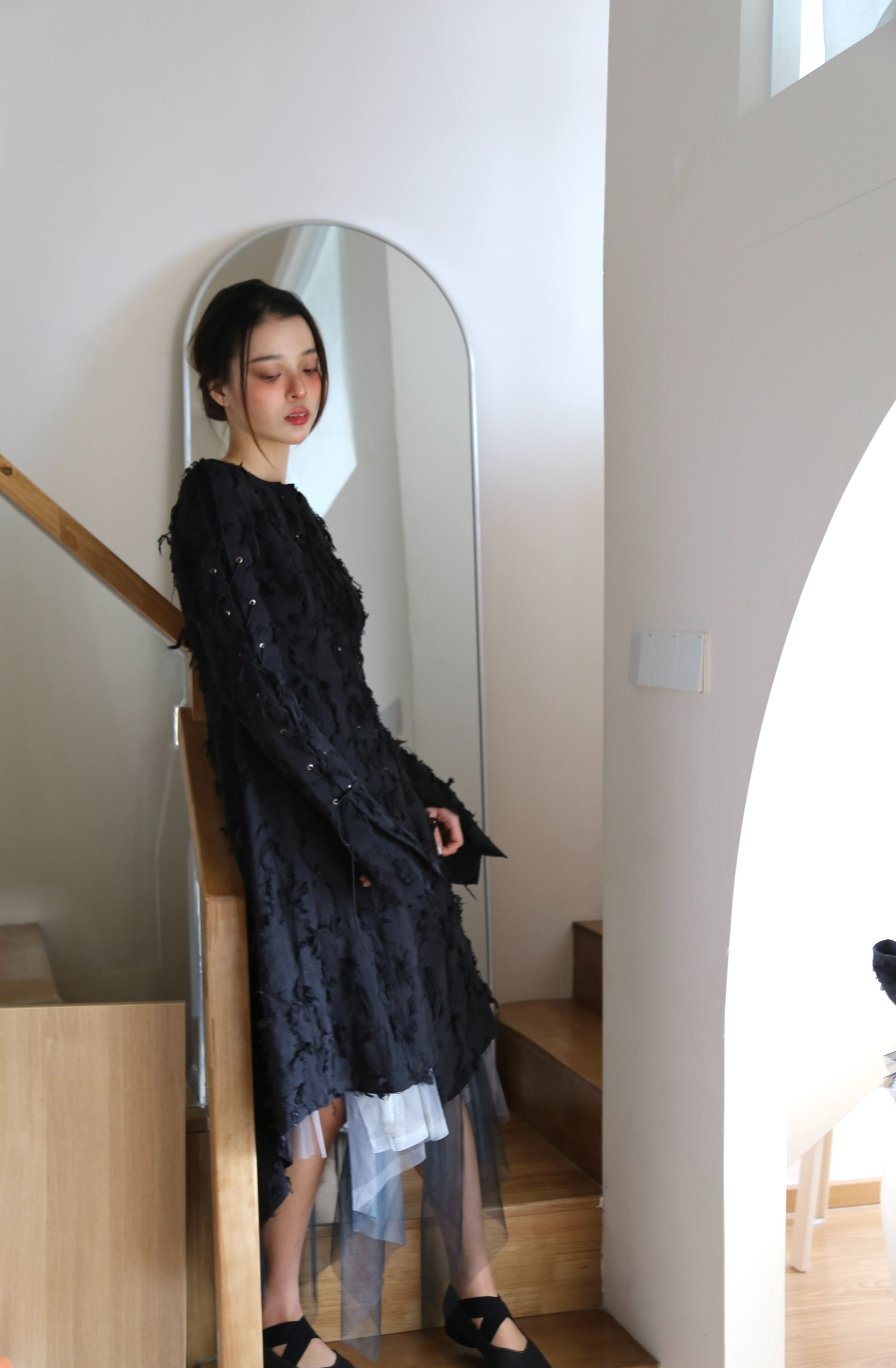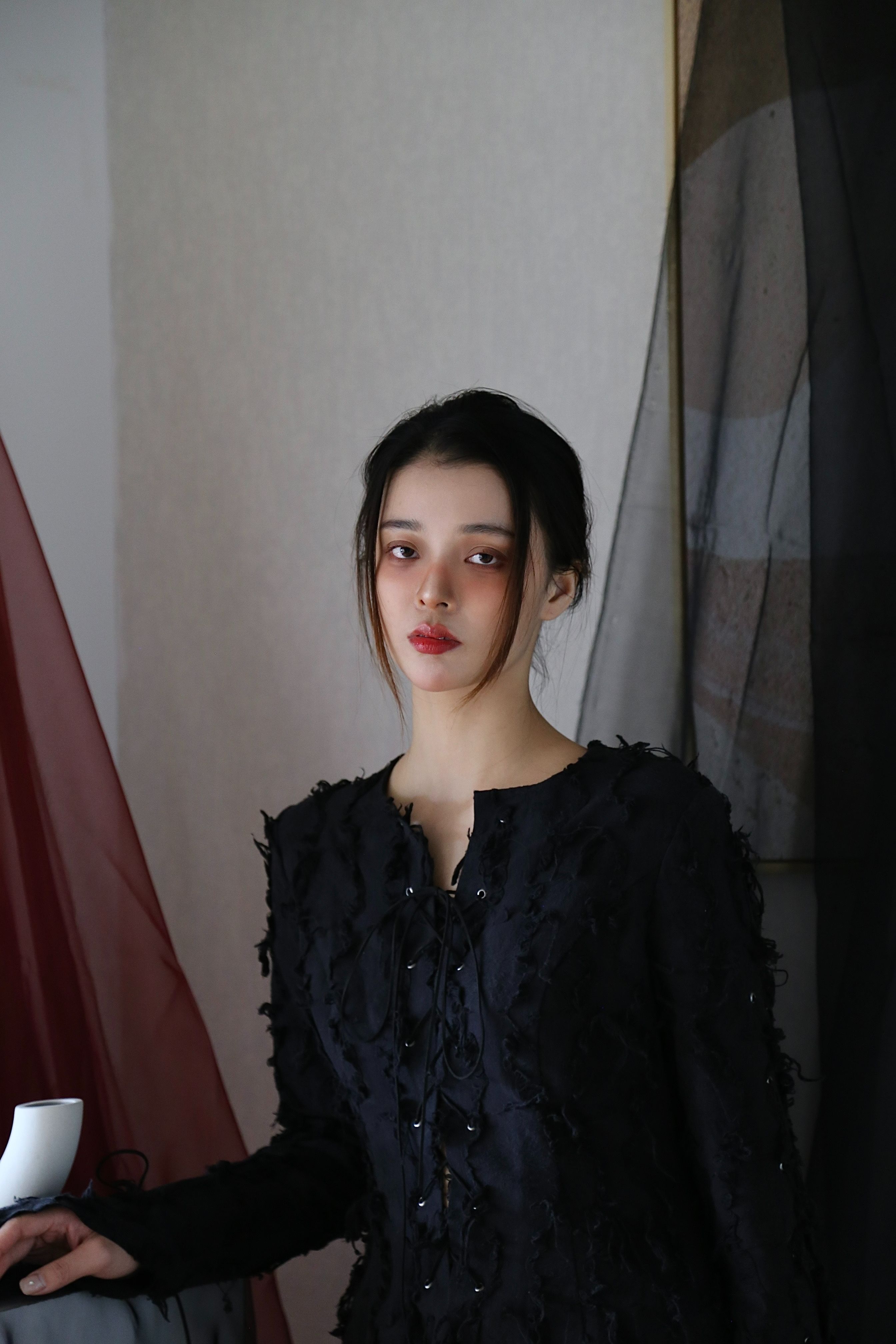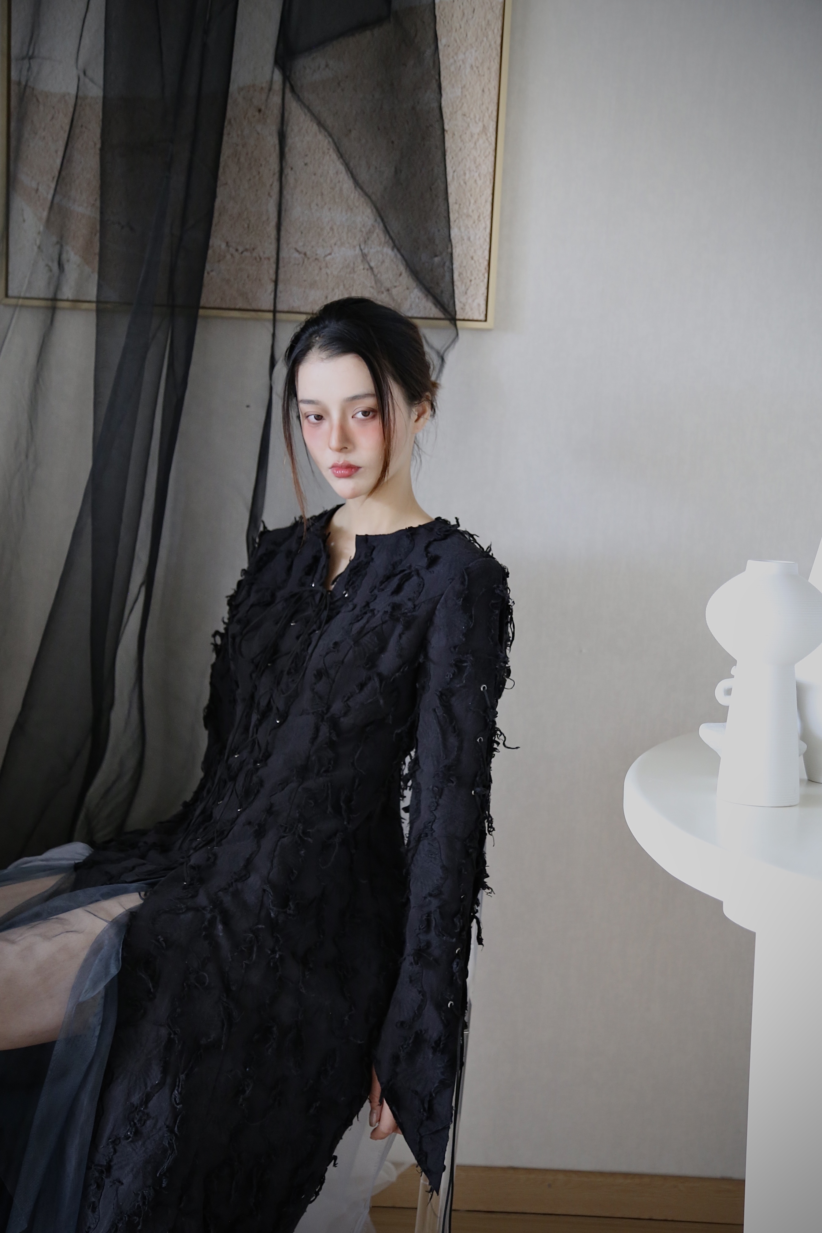 Front strap+slit design, paired with metal eyelets on flared sleeves, comes with adjustable styling tension; The outer layer of fringed fabric has a strong texture, while the inner layer of gradient mesh skirt is faintly visible, forming a dynamic layer of virtual and real interweaving between walking. Can be worn alone to create a dark look, or layered as an outerwear, balancing the sense of ceremony and versatility in multiple scenes