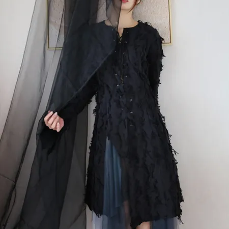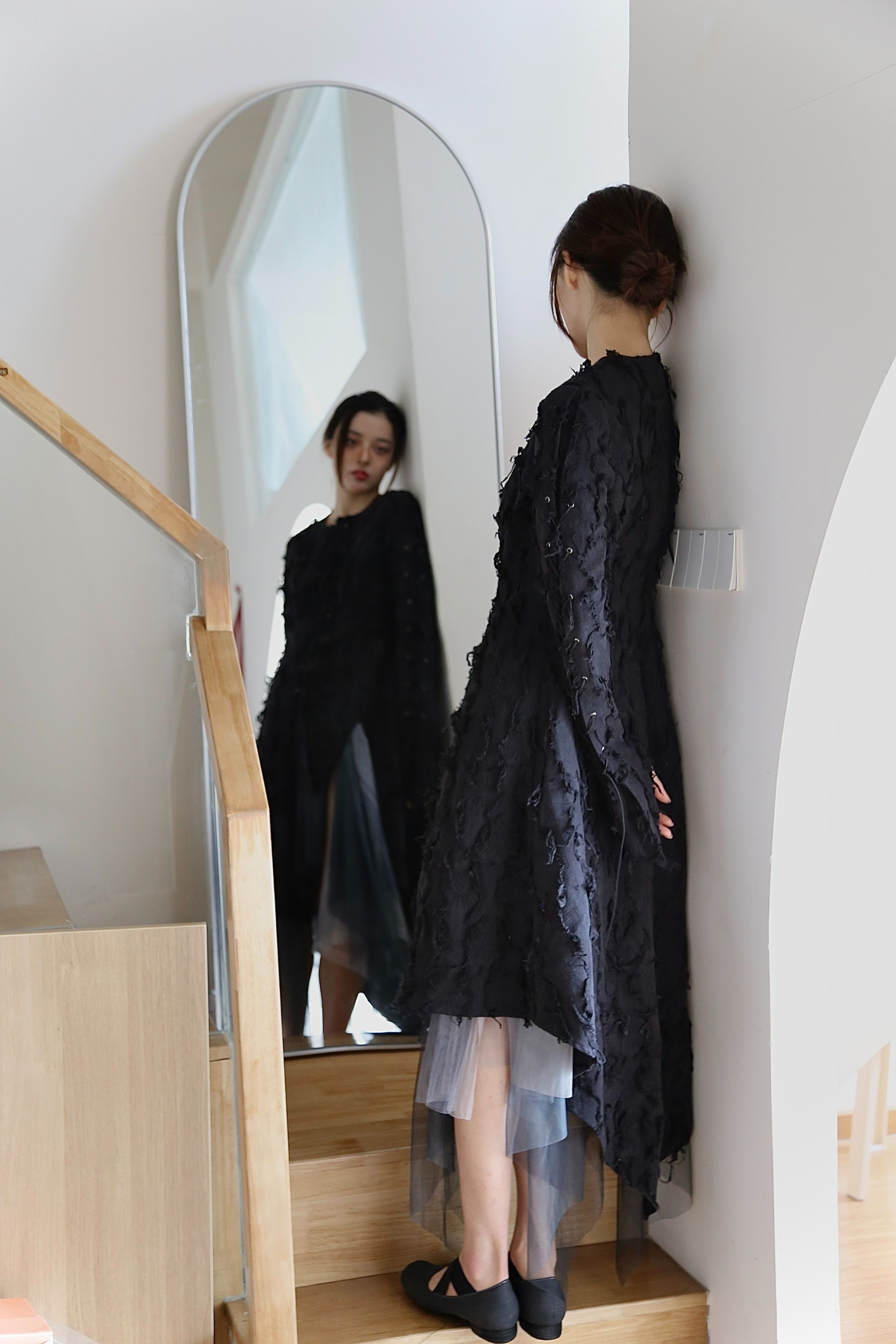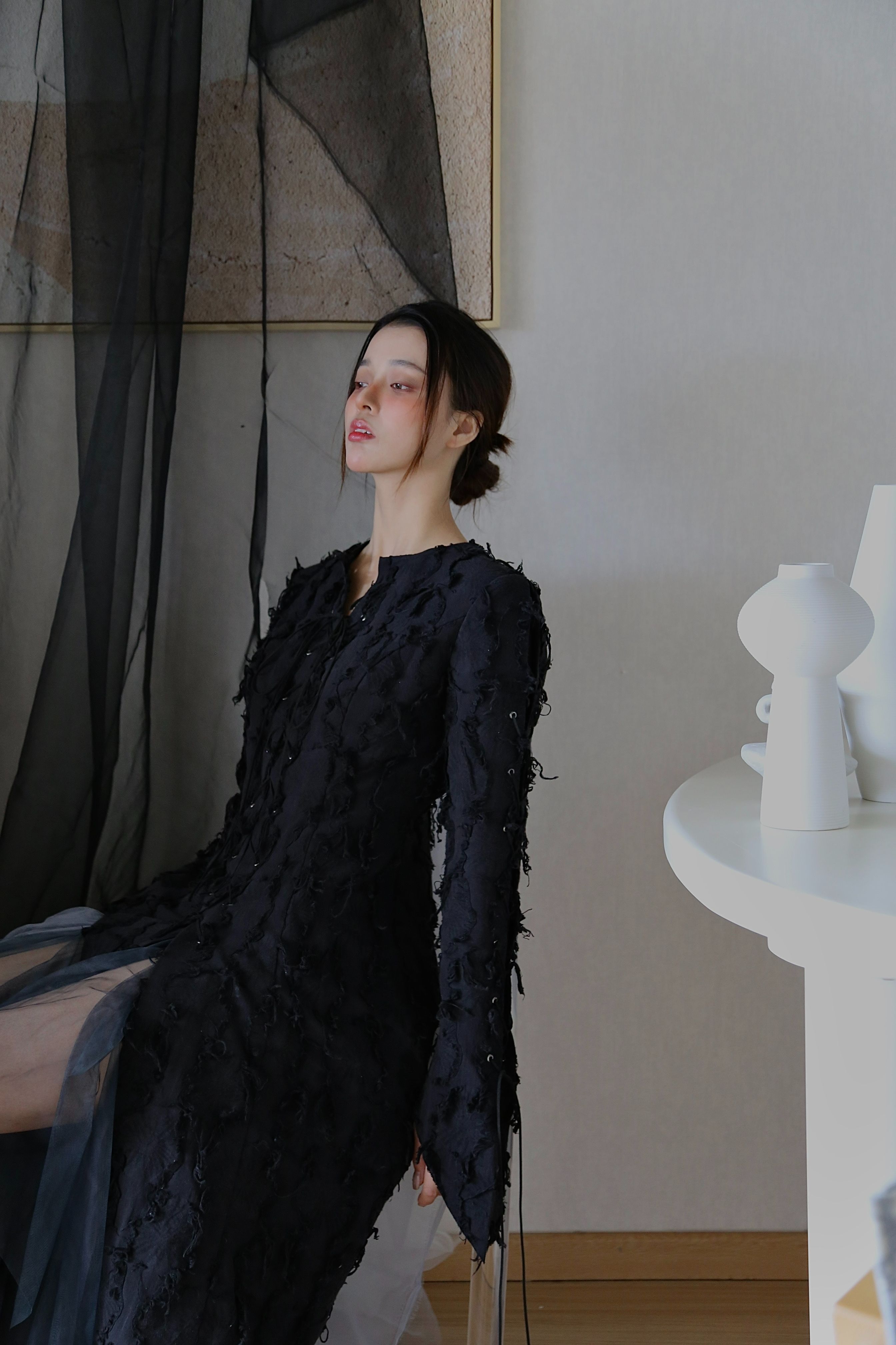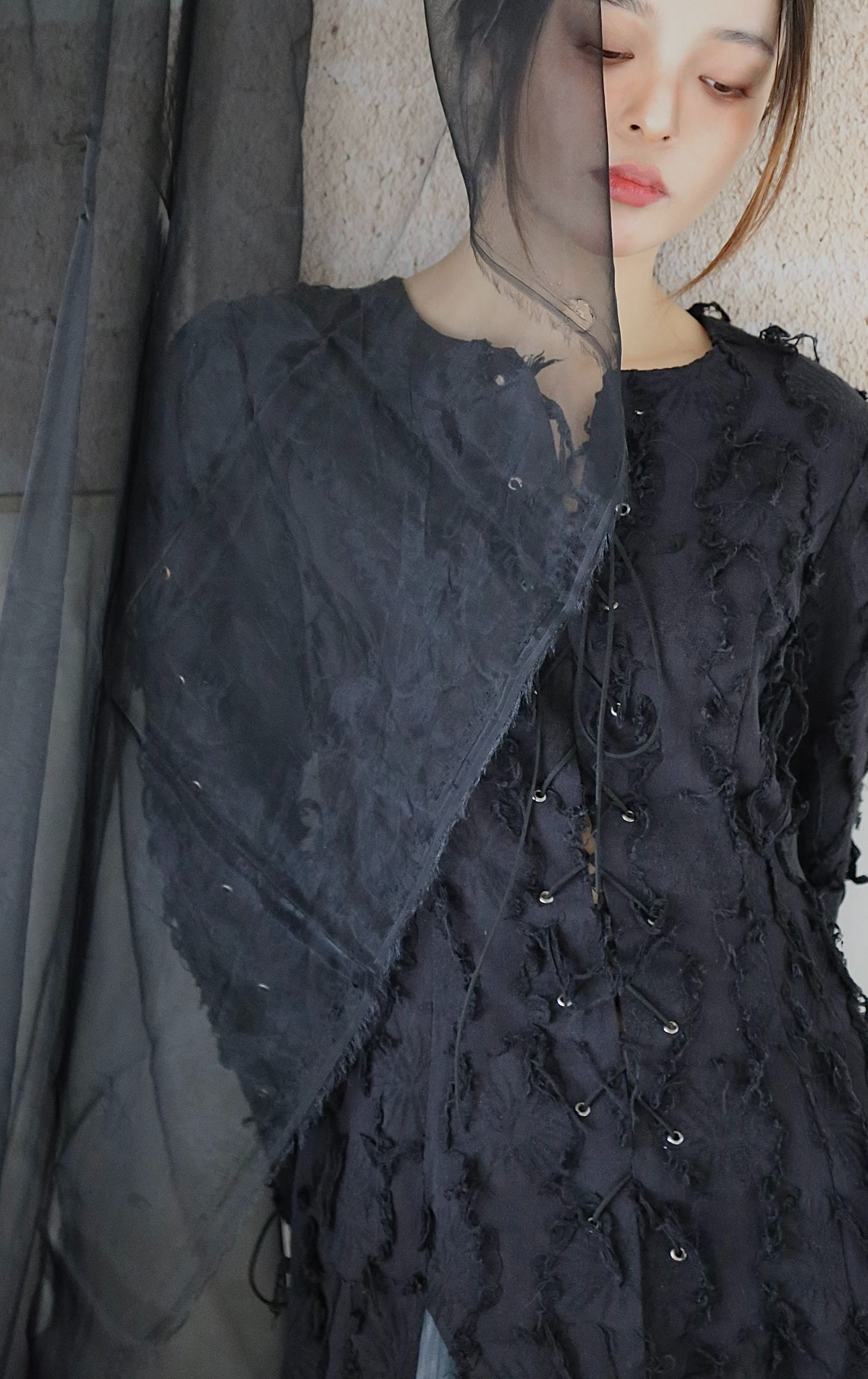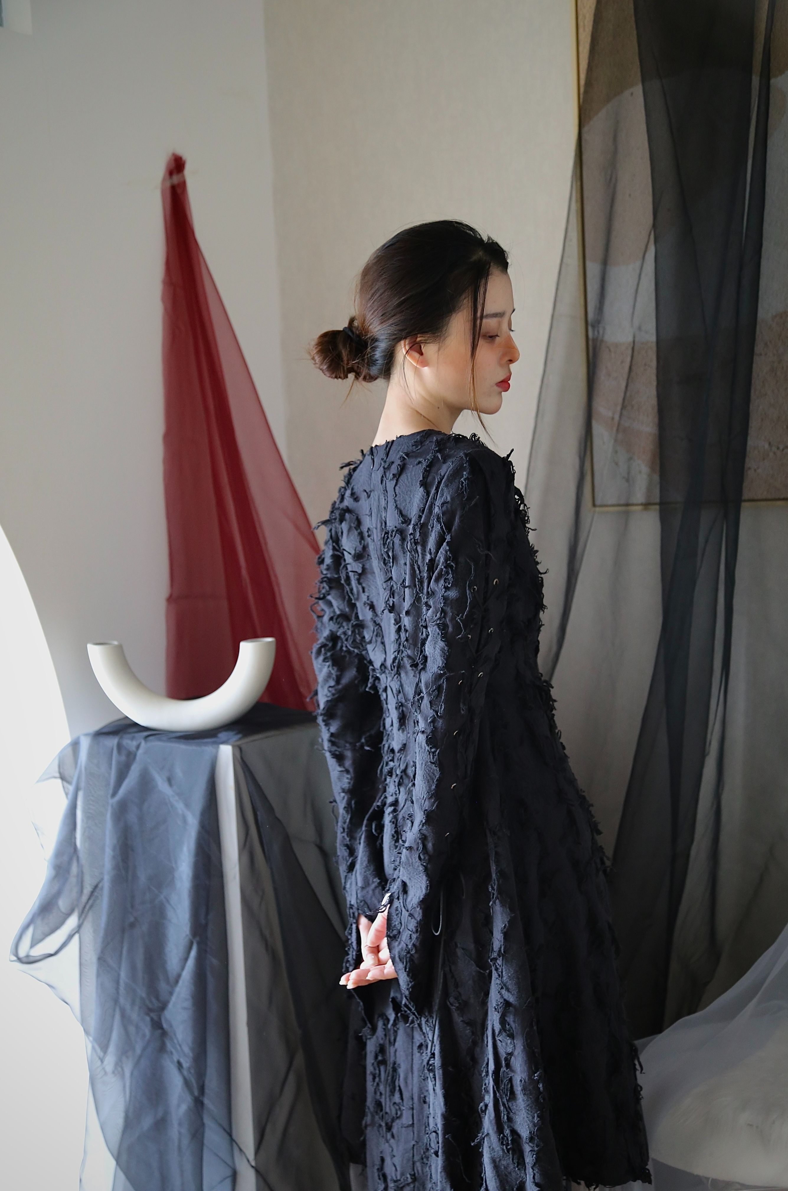 Front strap+slit design, paired with metal eyelets on flared sleeves, comes with adjustable styling tension; The outer layer of fringed fabric has a strong texture, while the inner layer of gradient mesh skirt is faintly visible, forming a dynamic layer of virtual and real interweaving between walking. Can be worn alone to create a dark look, or layered as an outerwear, balancing the sense of ceremony and versatility in multiple scenes