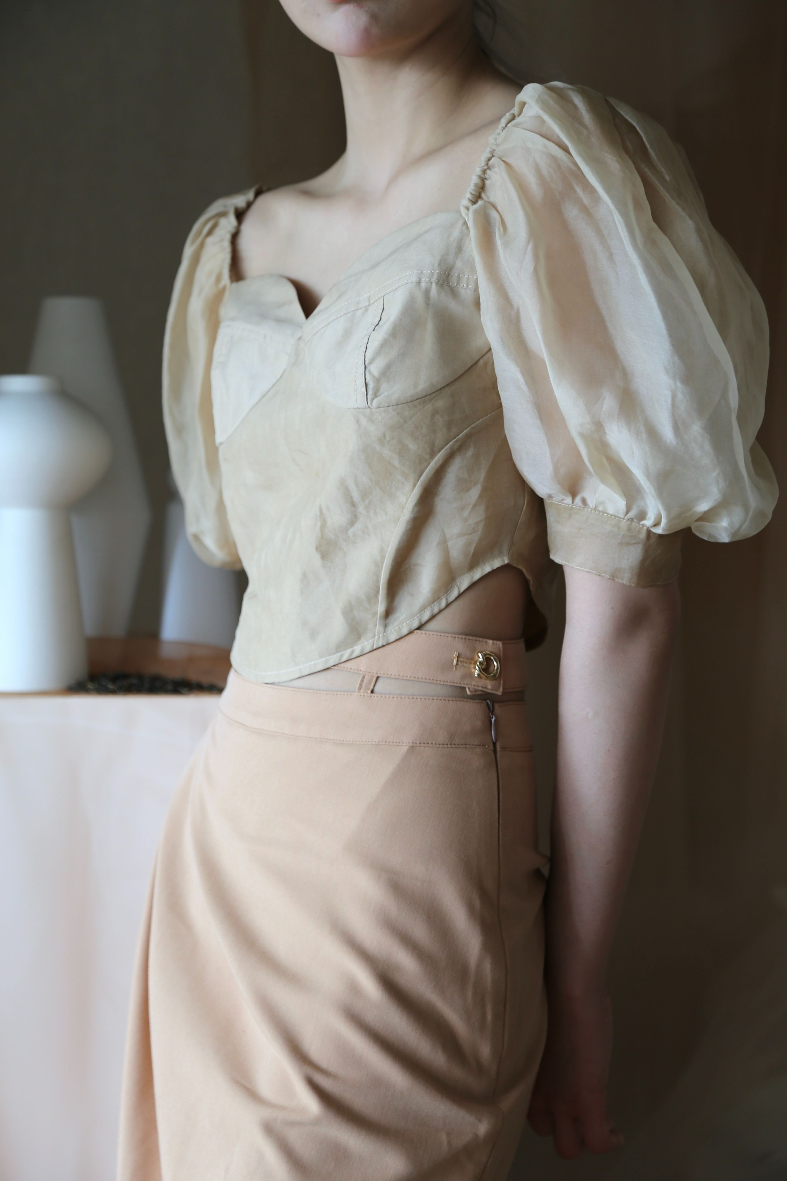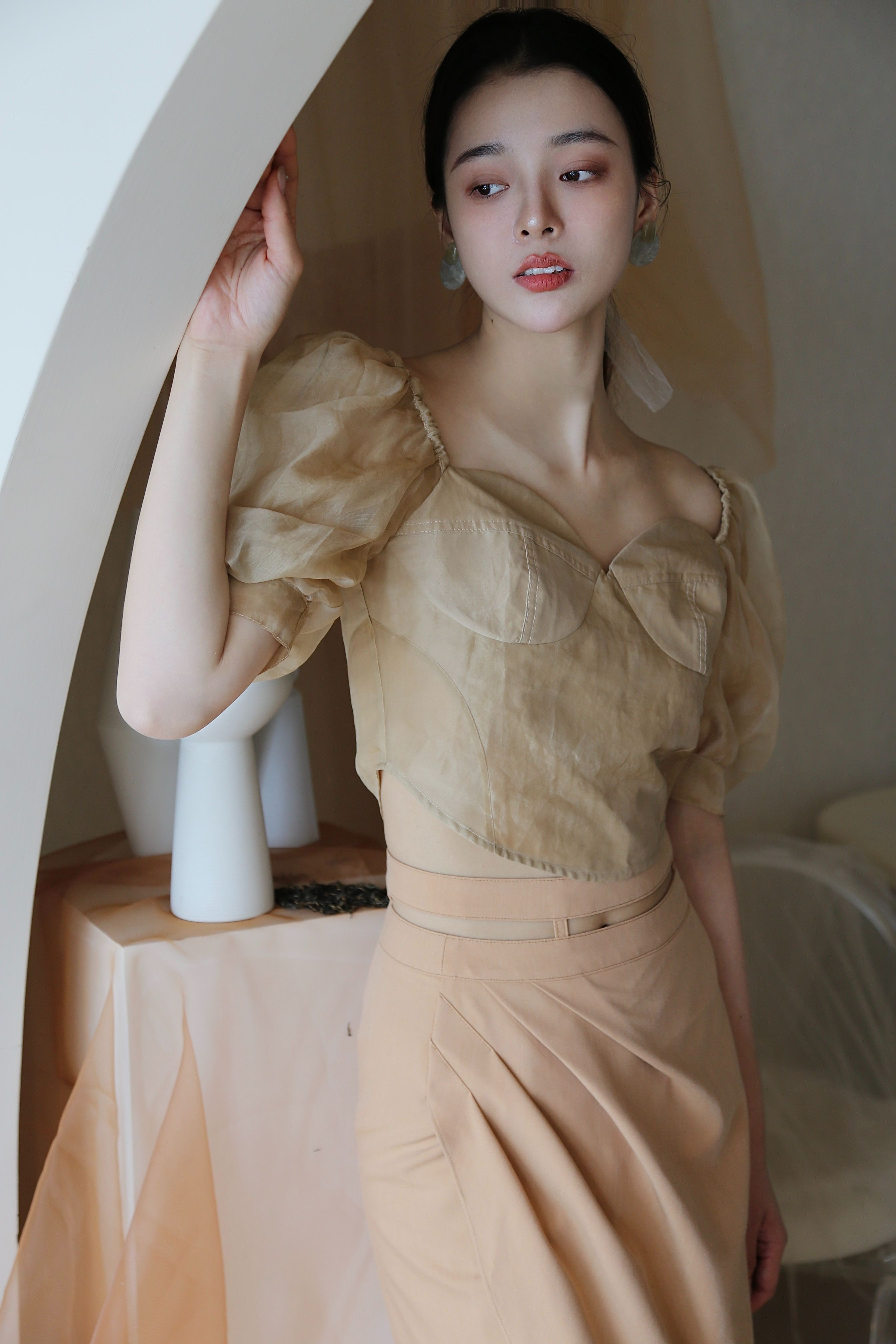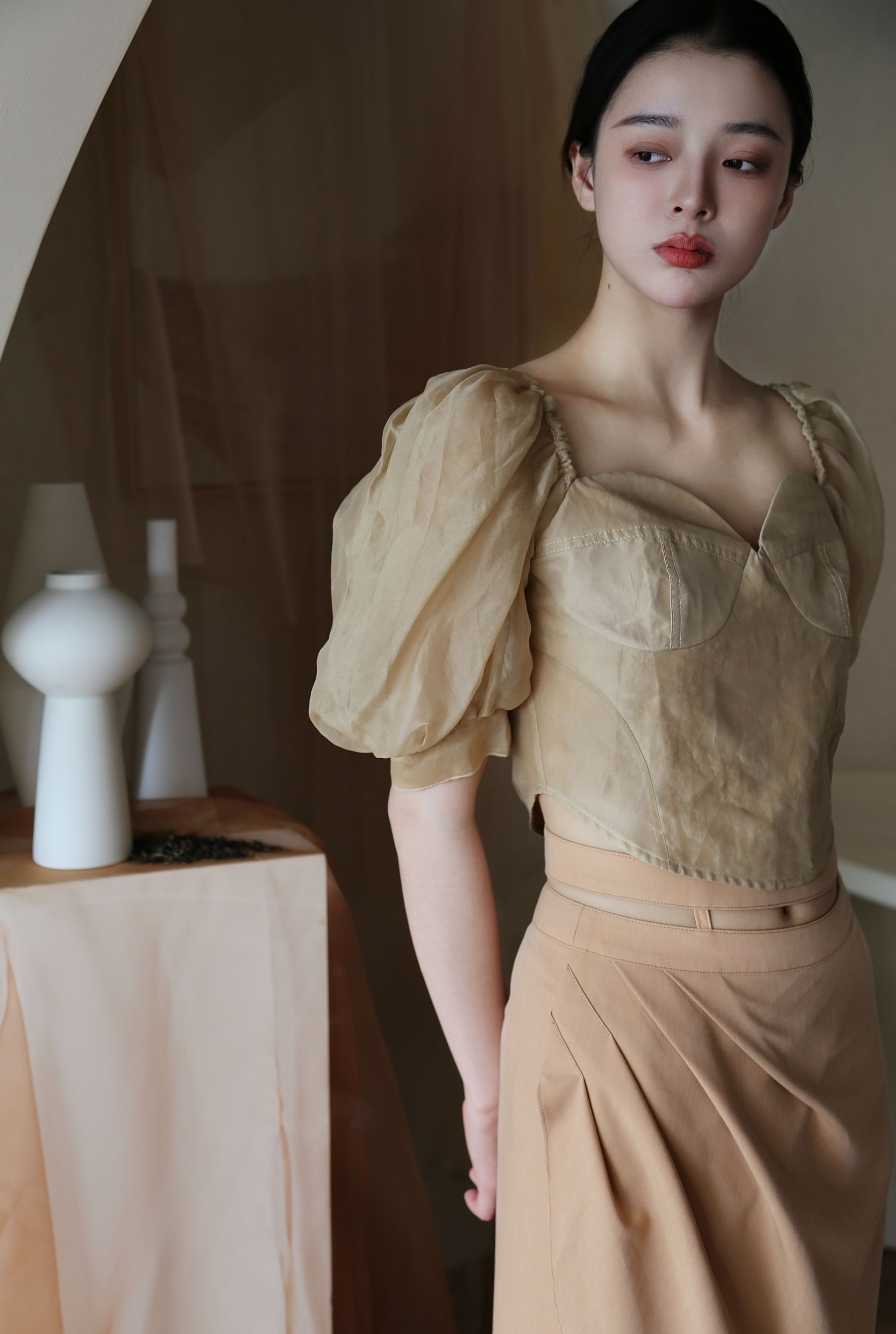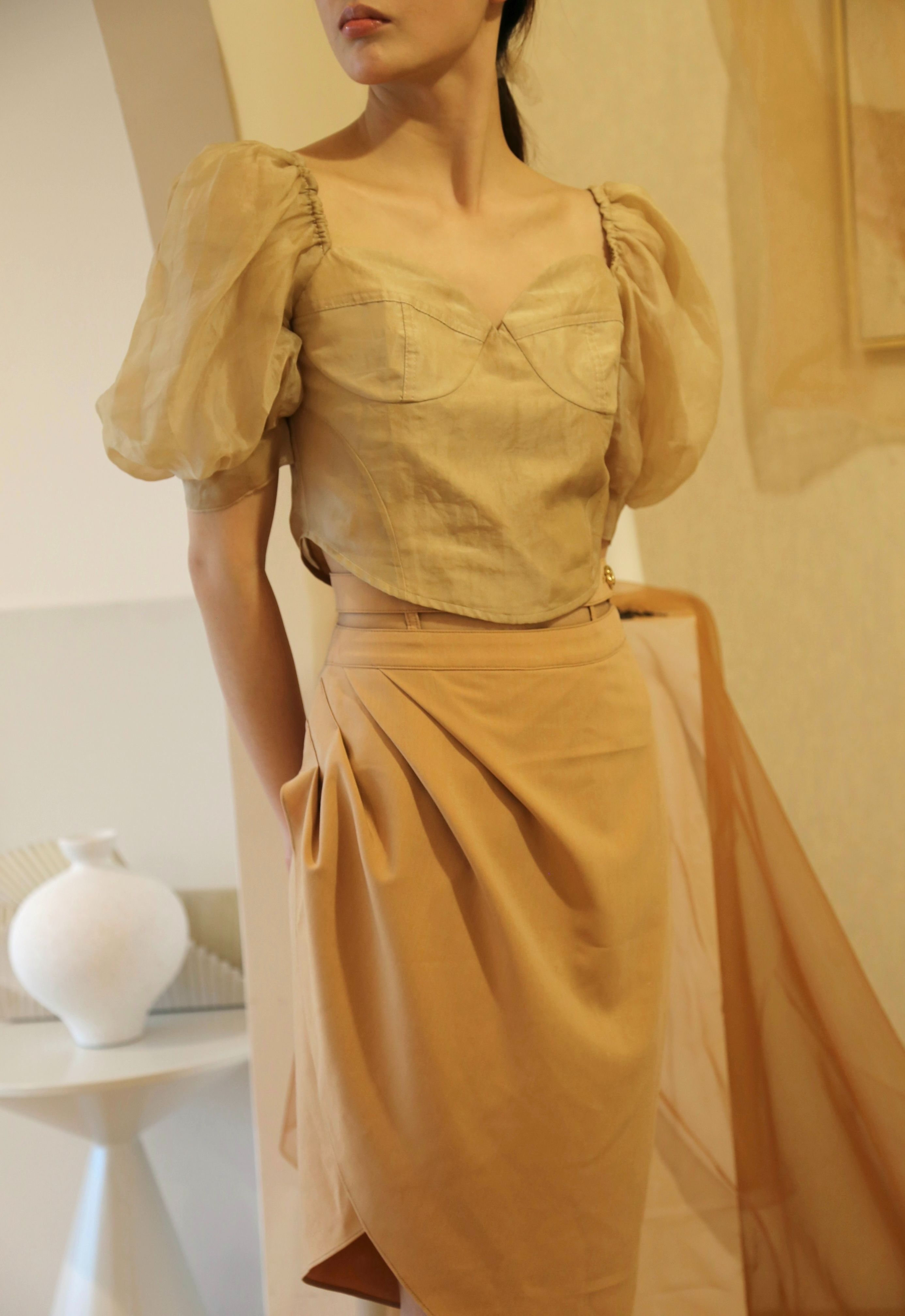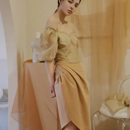 Adopting chest cup segmentation and one shoulder bubble sleeve design, it comes with a retro movie atmosphere. The hollowed out side waist and metal buckle details break conventions, and the tea dyed fabric bubble sleeves come with soft light filters, balancing breathability and styling. As a complementary item in the series, it can be adapted to the same series of skirts and trousers, increasing the series' connectivity and making it a potential explosive product that combines topicality and practicality.