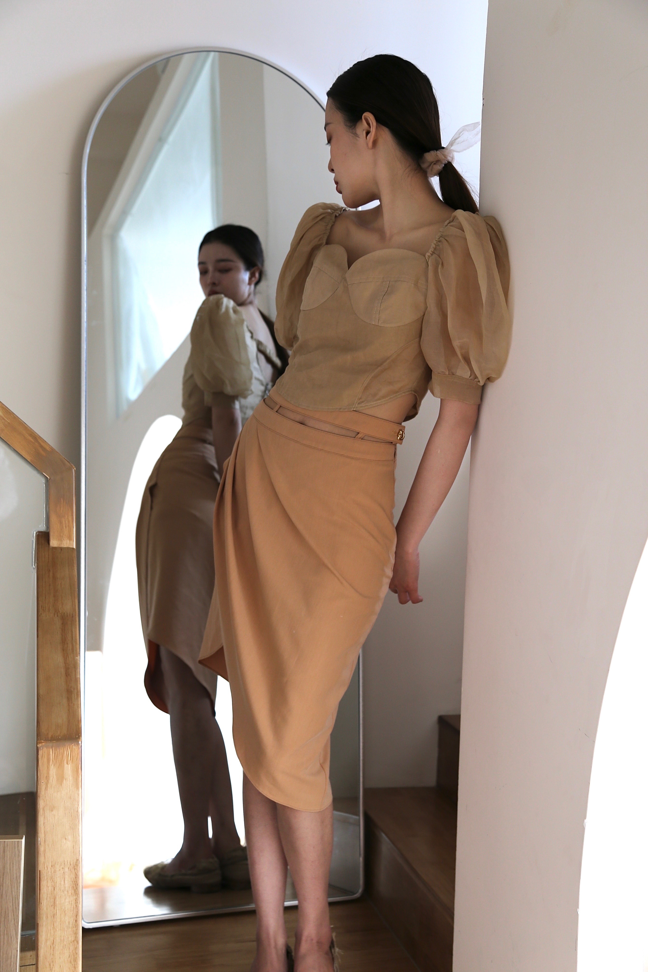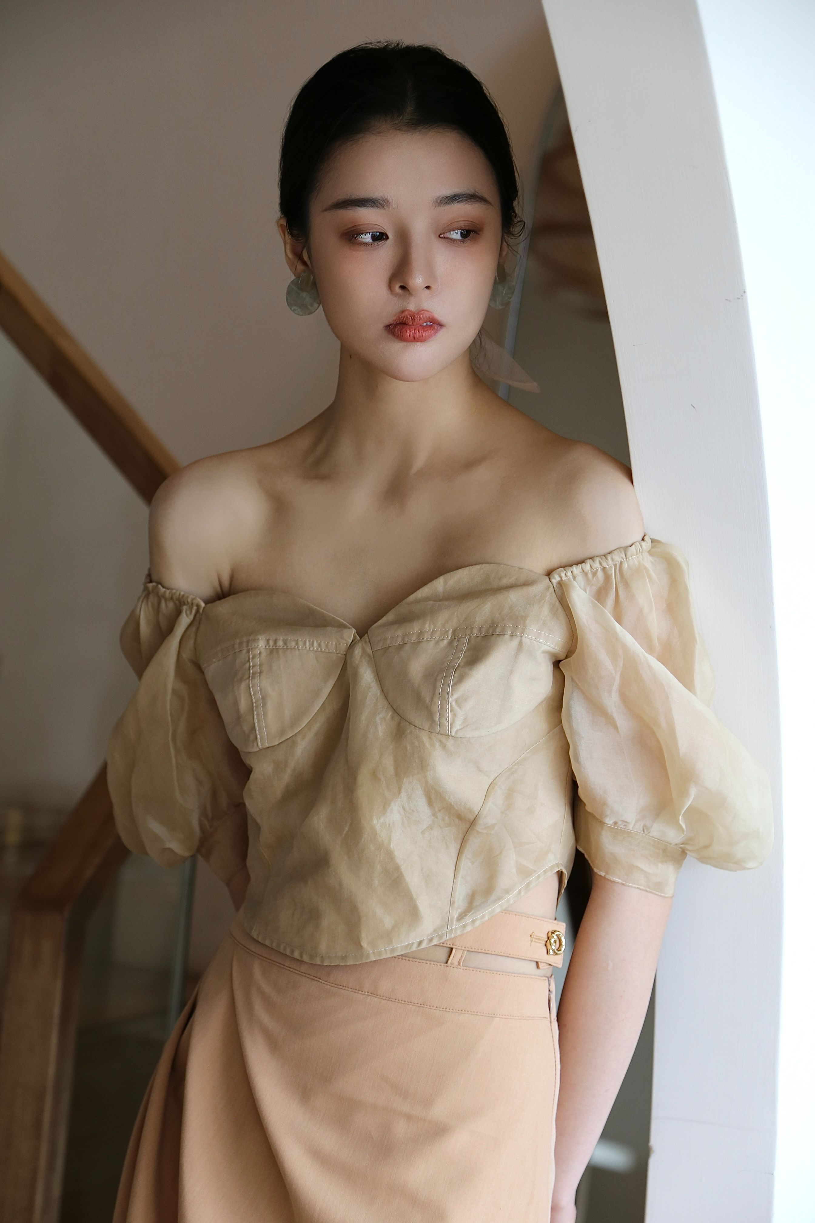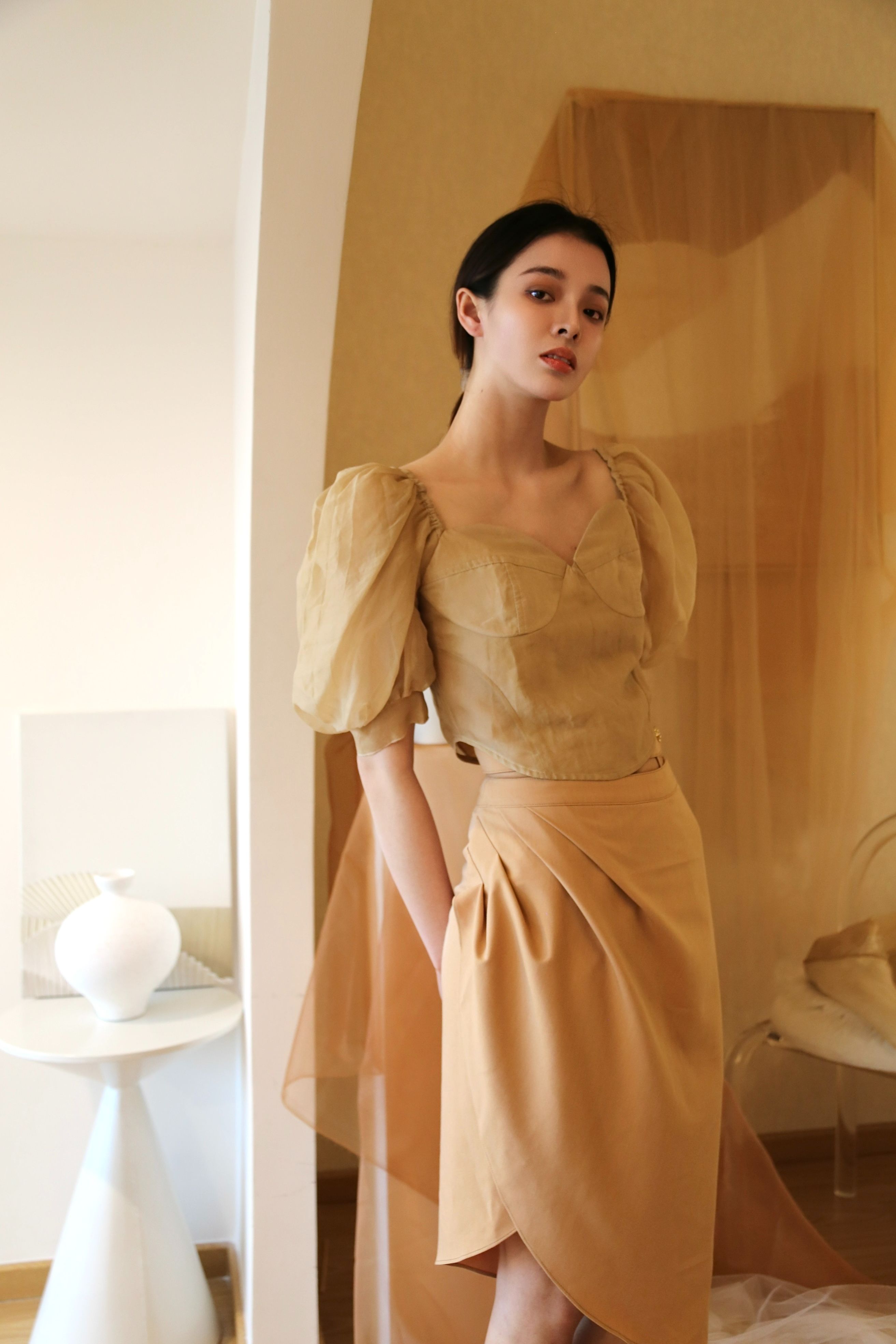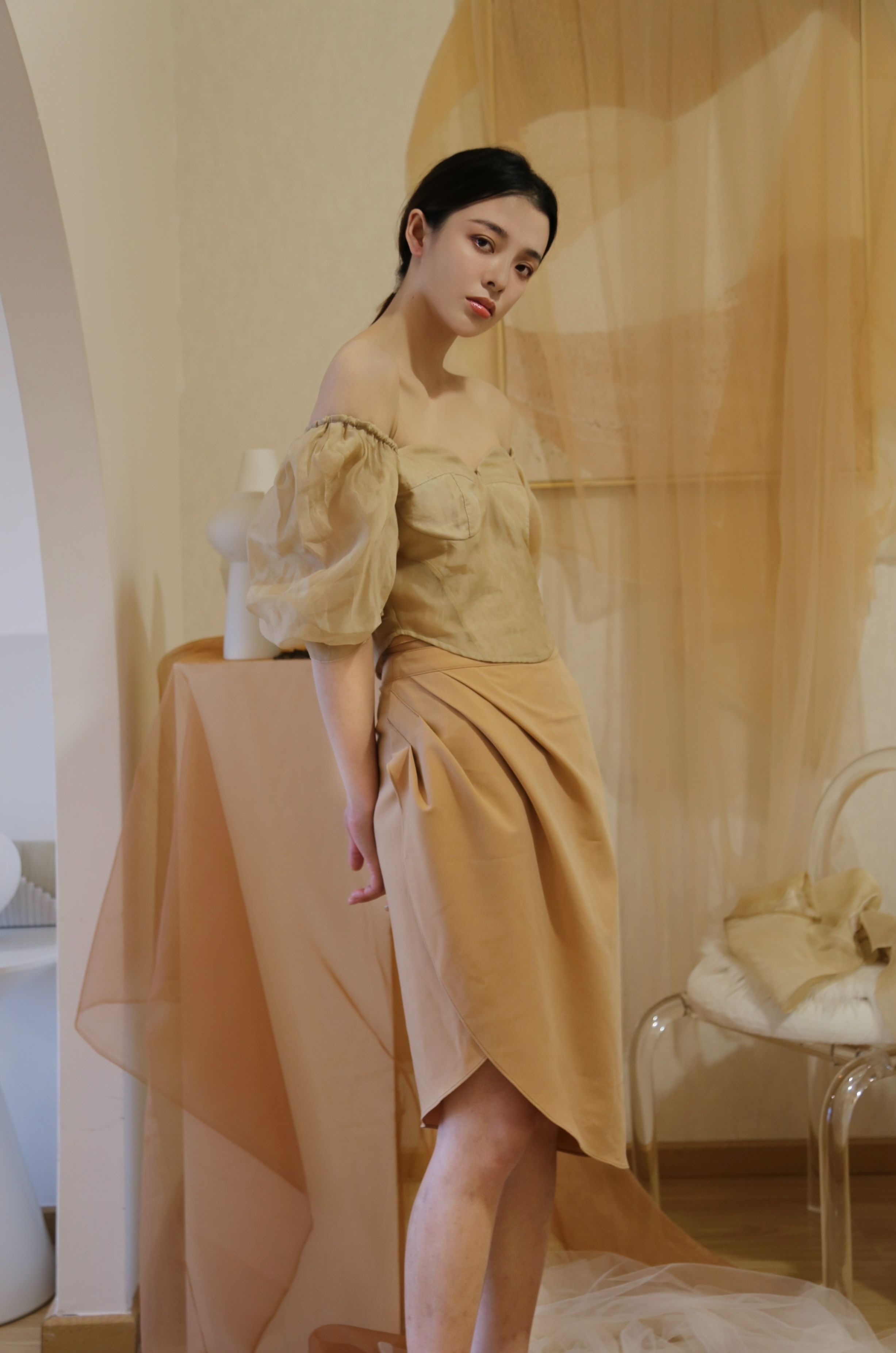 Adopting chest cup segmentation and one shoulder bubble sleeve design, it comes with a retro movie atmosphere. The hollowed out side waist and metal buckle details break conventions, and the tea dyed fabric bubble sleeves come with soft light filters, balancing breathability and styling. As a complementary item in the series, it can be adapted to the same series of skirts and trousers, increasing the series' connectivity and making it a potential explosive product that combines topicality and practicality.