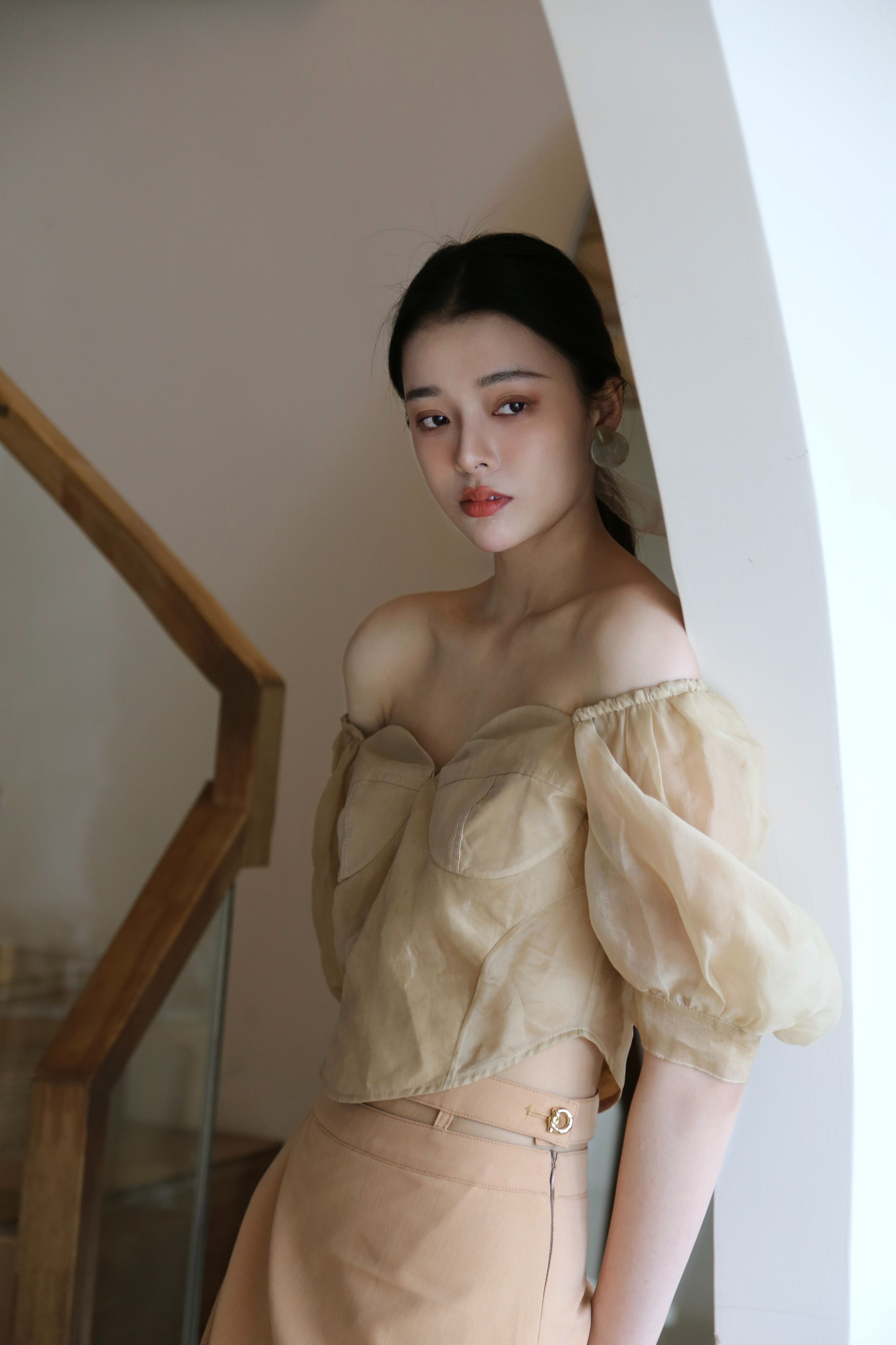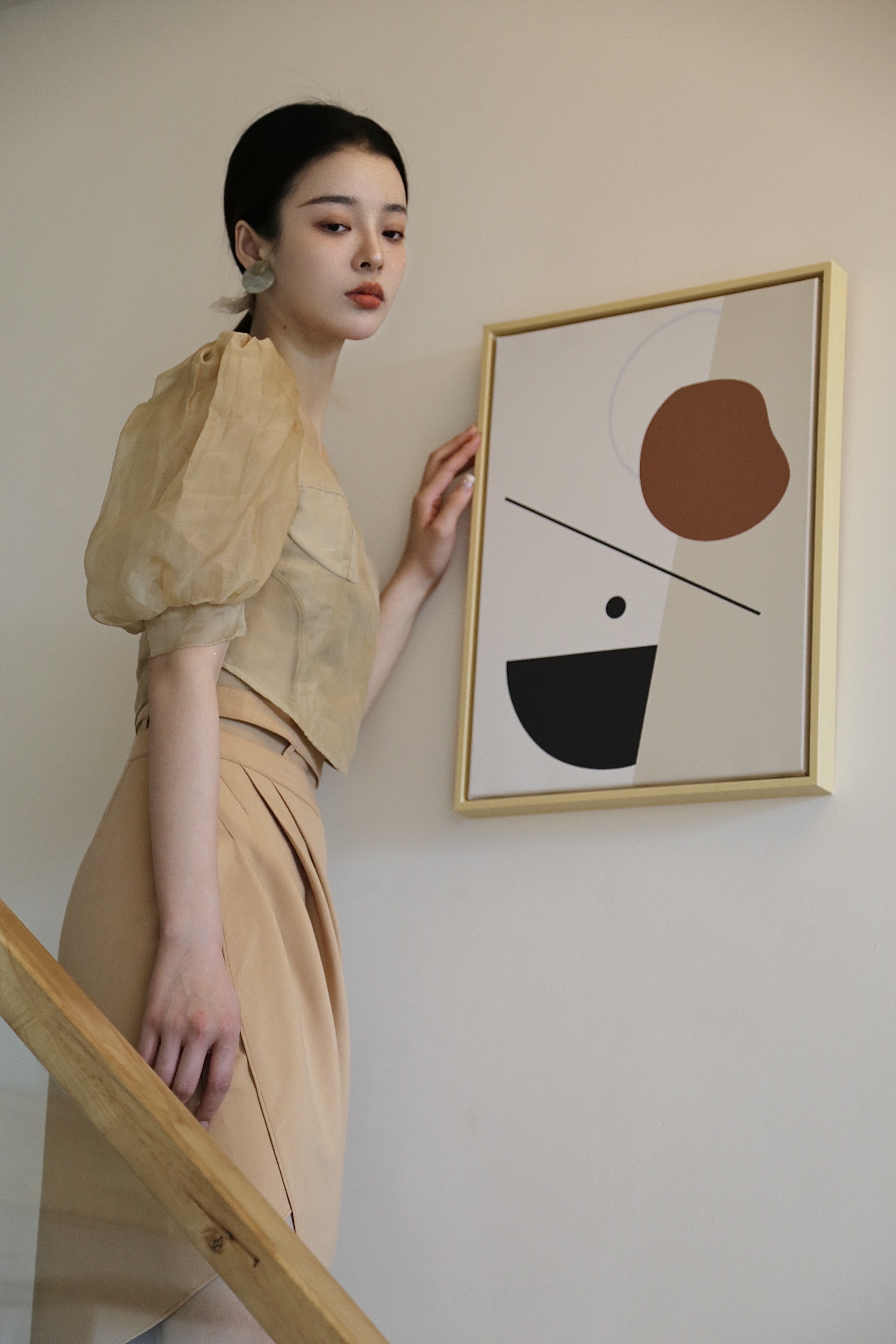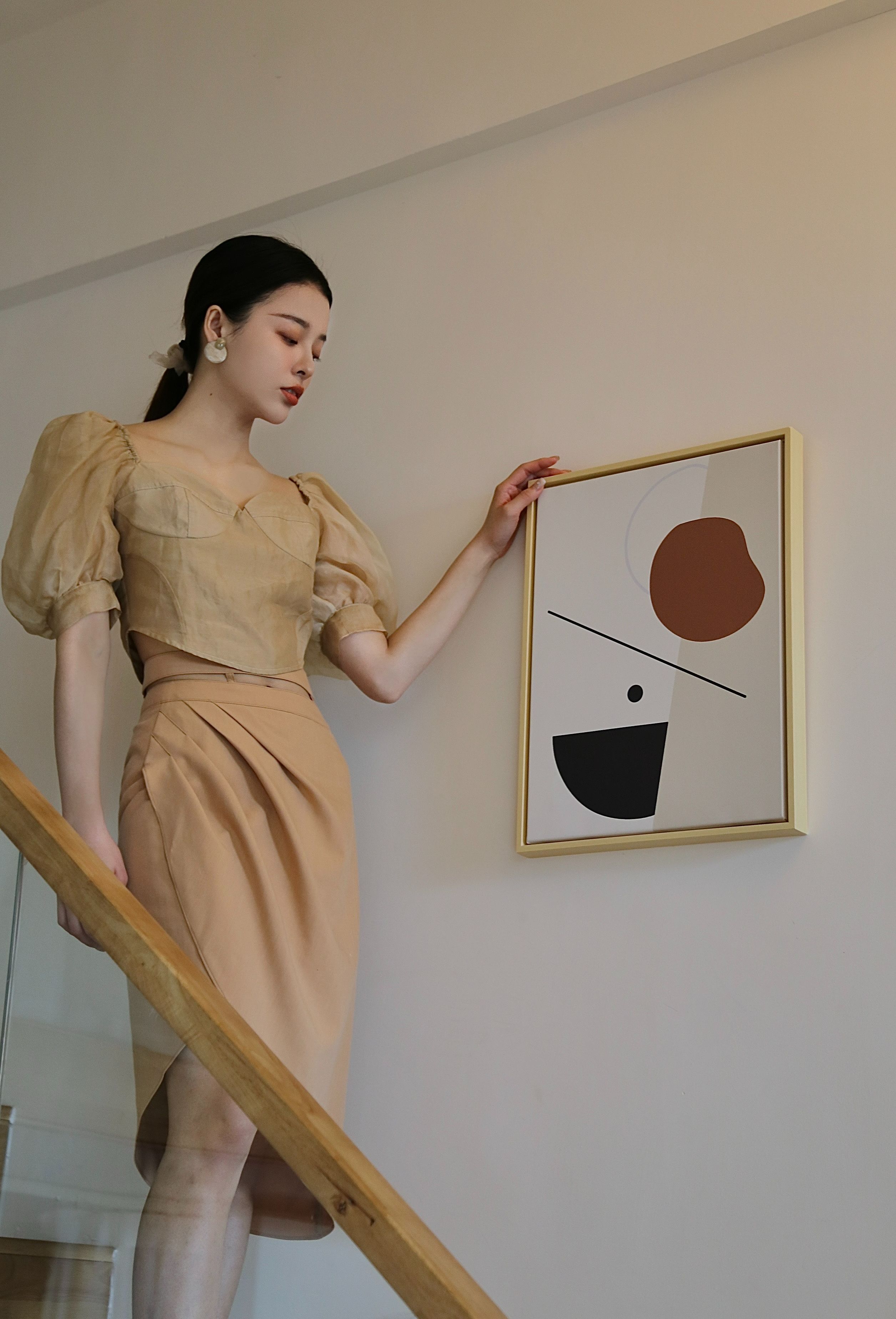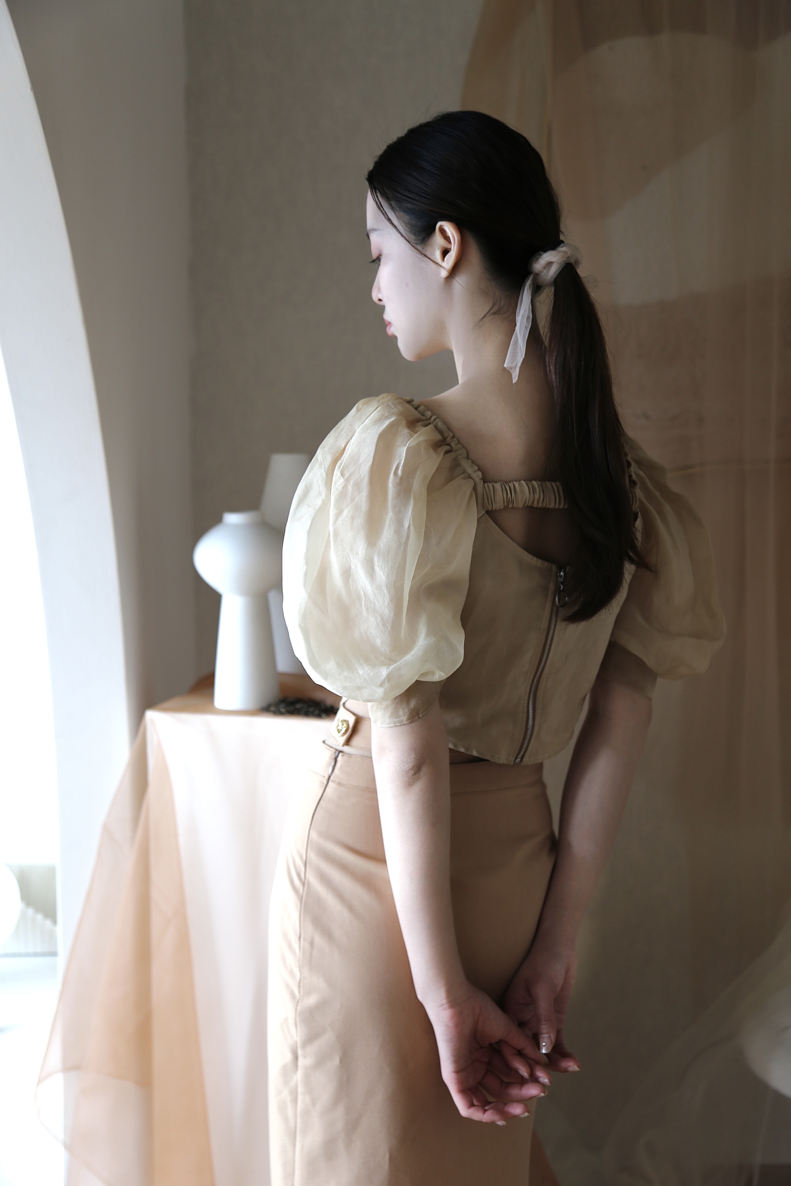 Adopting chest cup segmentation and one shoulder bubble sleeve design, it comes with a retro movie atmosphere. The hollowed out side waist and metal buckle details break conventions, and the tea dyed fabric bubble sleeves come with soft light filters, balancing breathability and styling. As a complementary item in the series, it can be adapted to the same series of skirts and trousers, increasing the series' connectivity and making it a potential explosive product that combines topicality and practicality.
