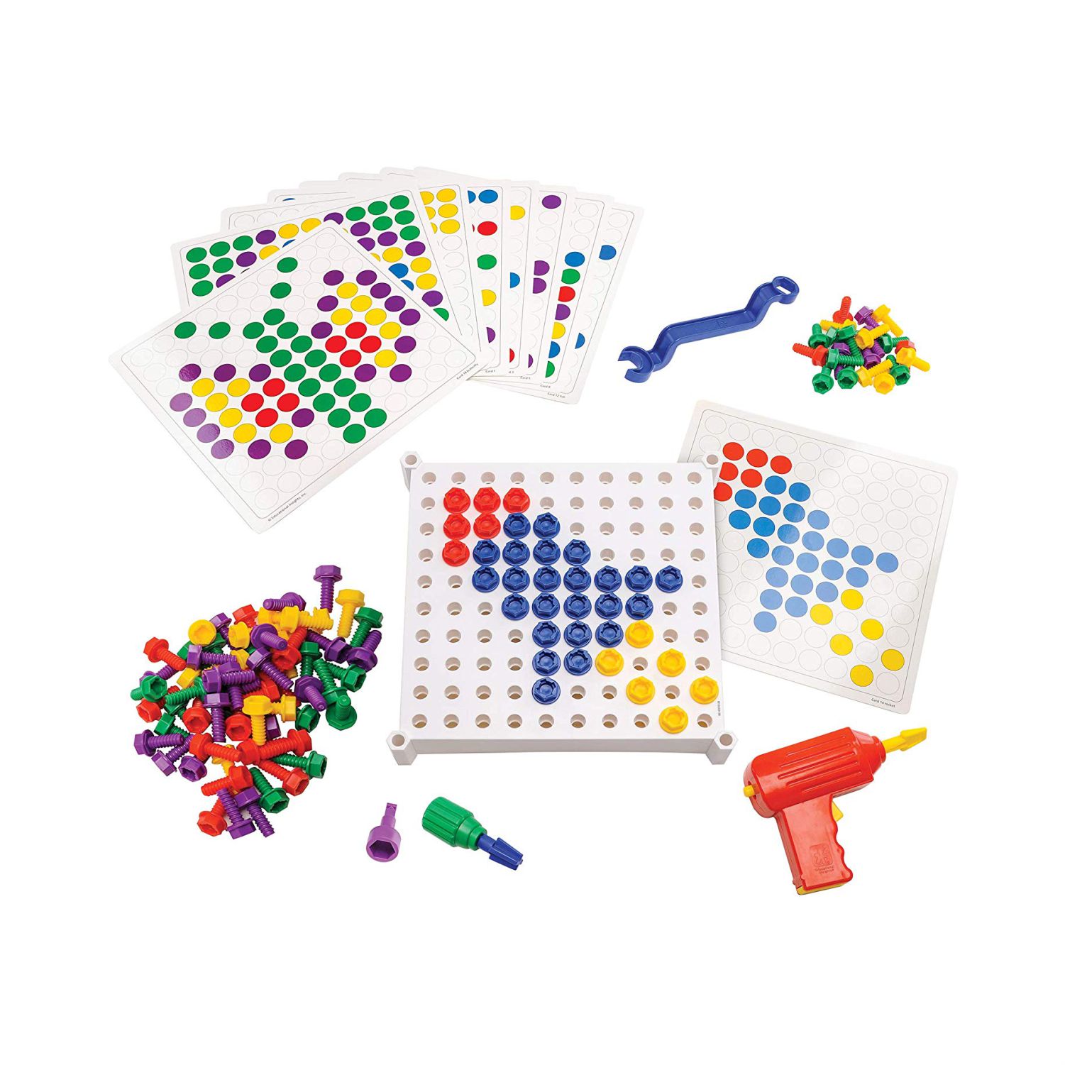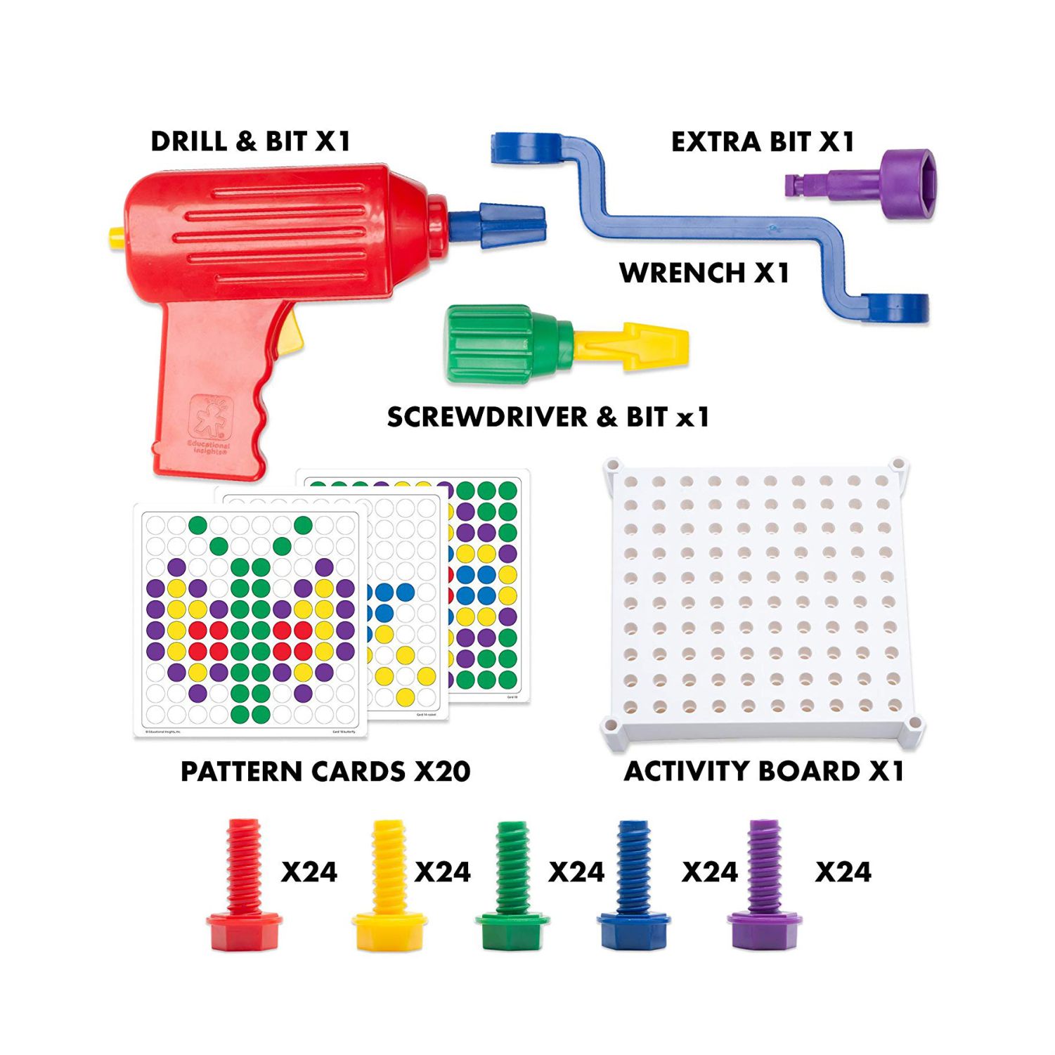 • INCLUDES: 120 chunky plastic bolts, reversible power drill, screwdriver, combination wrench, 2 drill bits, and 20 easy-to-follow design activity cards
