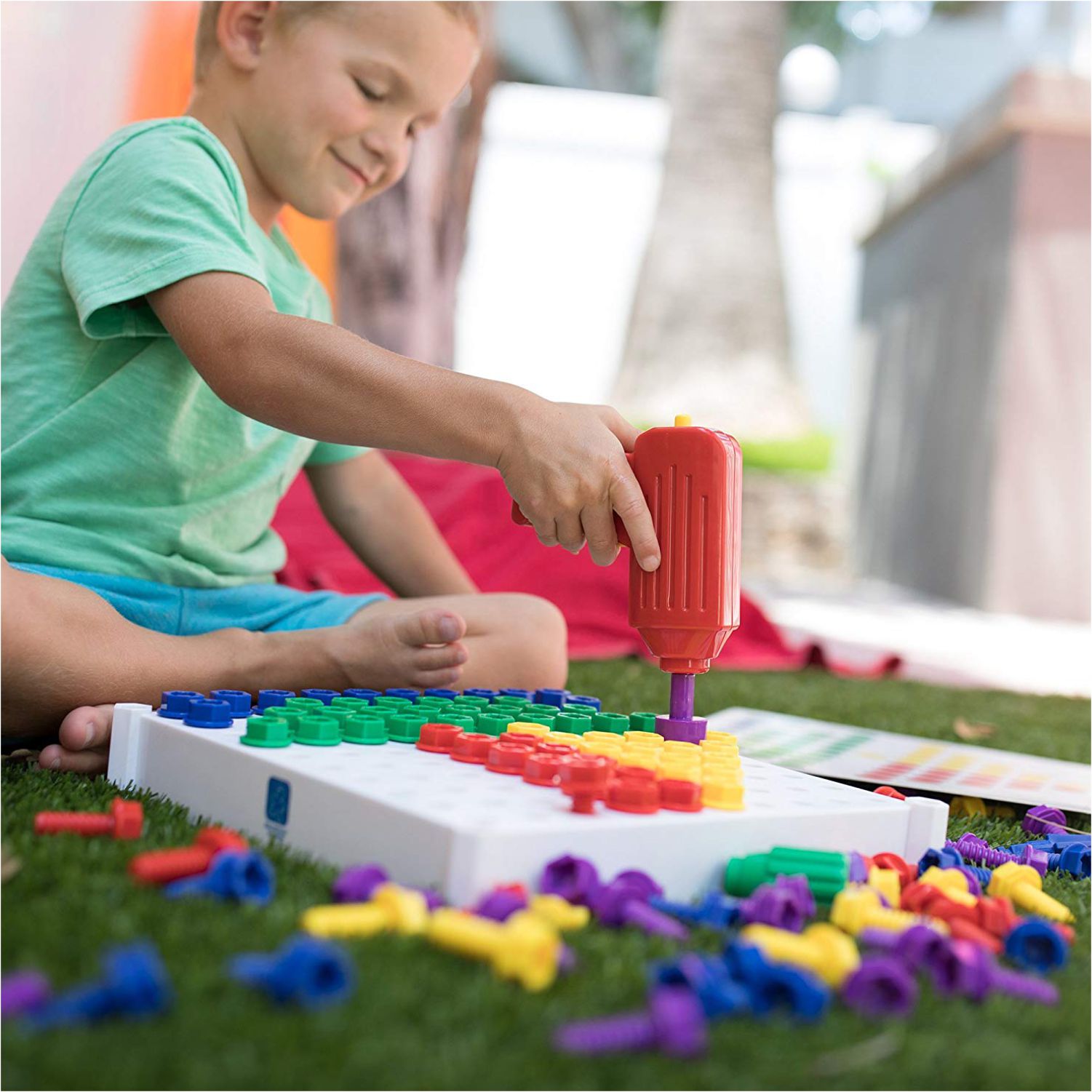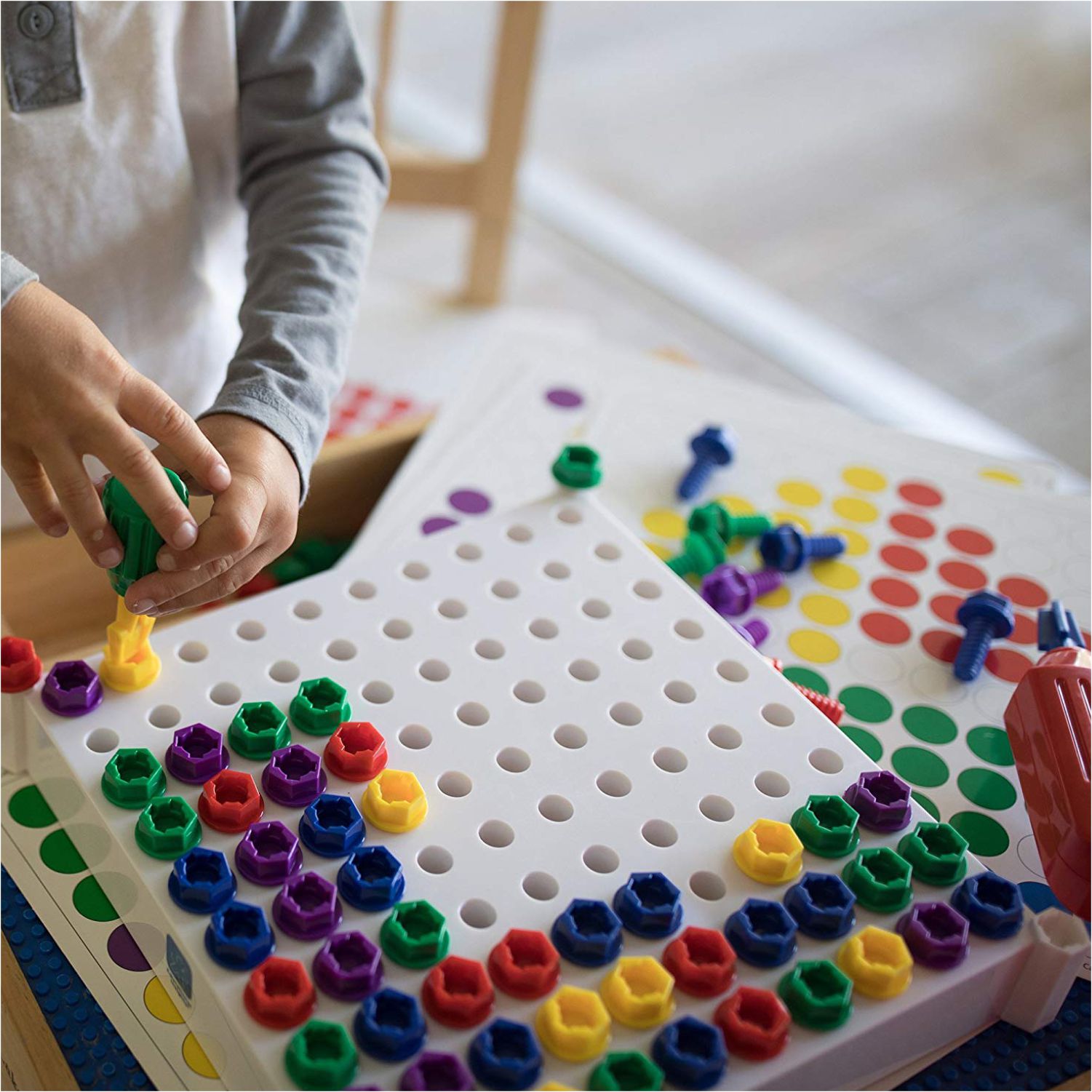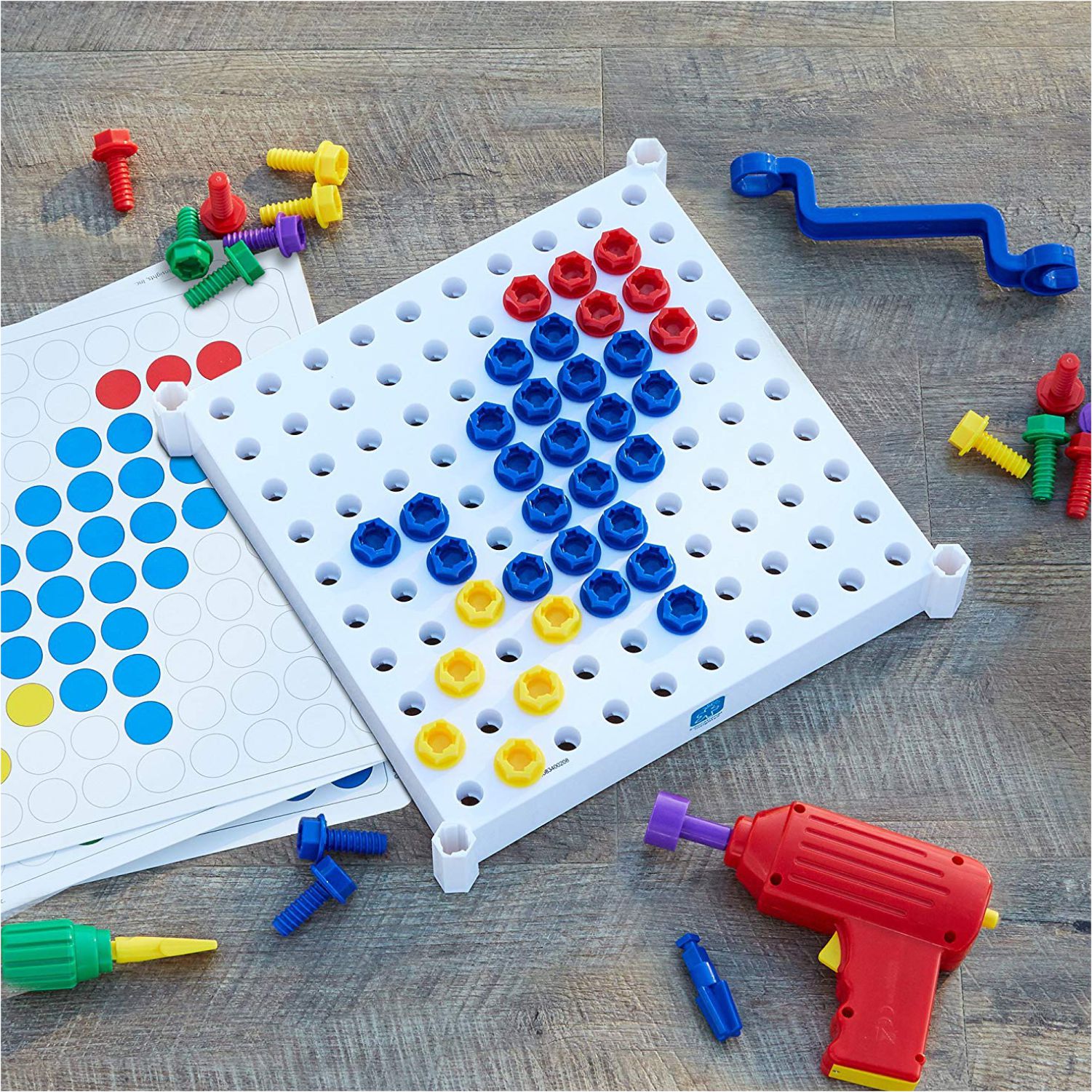 • LET'S GET BUILDING! Kids power up their imaginations and build coordination skills as they drill chunky, kid-sized bolts into a sturdy activity board.