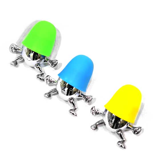 This cute egg cup features a human shaped design with arms and legs. It is constructed with a stainless steel body and a plastic top. The eye-catching egg cup offers a stylish way to hold a boiled egg.