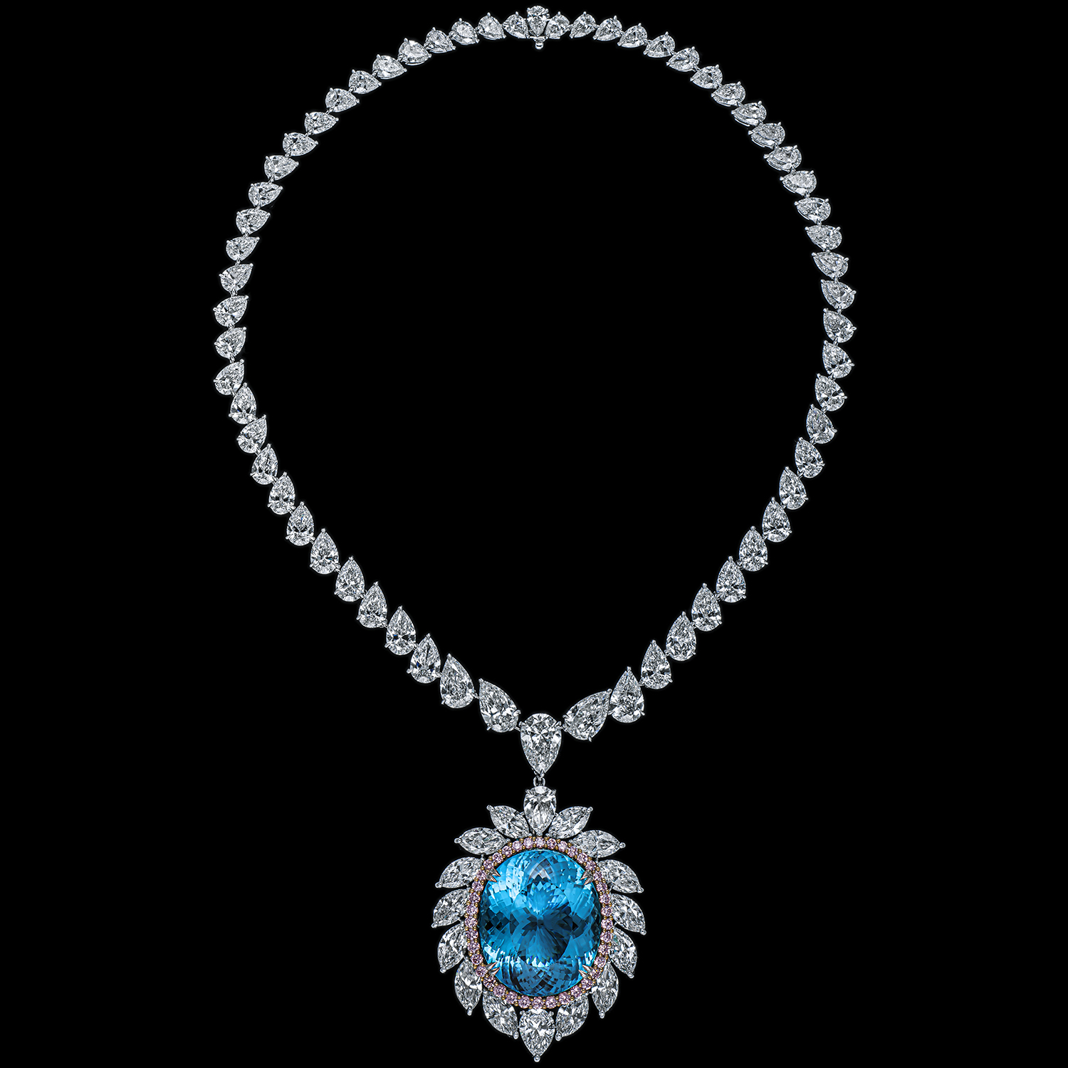 Weighing nearly 60 carats is this oval Brazilian Paraiba which is one of the rarest found in the world, for both its electric color and tremendous size. Adorned with a contrasting fancy pink pave and surrounded by a wreath of oval and pear shaped diamonds to create a captivating pendant, delicately suspended from a impeccable strand of over 45 carats of diamonds.