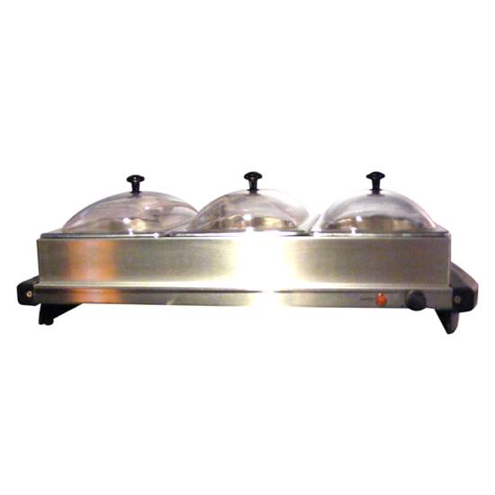 This electric buffet server holds 3.35L foods in each 3 individual dishes. Chafing dishes are removable and can be placed on warming tray to make foods stay warm. Each dish comes with clear dome lids. The heating surface of the warming tray is durable and easy to clean.