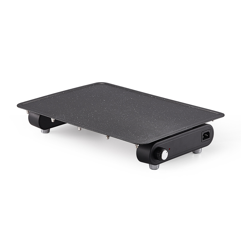 The core heating structure of this baking pan features a low-power thin-film heating module independently developed by Calandx Technology.Using Calandx technology's patented thin film and heating structural device technology, the product has obvious technological advantages compared with similar market applications, such as:Calandx technology thin film, which is independently developed by Calandx , heats faster and more efficiently, and consumes about half of the energy compared with traditional heating plants.The product model is KG-901, the color is black, the rated frequency is 50Hz, the rated voltage is 220v, the product size is 300*400mm.The big cookie sheet is the best way to eat and enjoy the barbecue good food light.Its main functions include a 40cm large baking pan,knob adjustment,non-stop heating,800W fire-power and DIY Fancy food.So it can meet the consumption of 2-8 people,meet the firepower requirements of different ingredients,roast chicken legs in 15 minutes,roast fish steak in 8 minuets,fried beef in 10 minutes.The highlight of this baking pan is that it has lighter smoke and less oil,which is healthier.Healthy cooking is more outstanding.The non-stick coating barbecue pan is easy to clean without any burden.The detachable base is convenient to carry when traveling and camping.